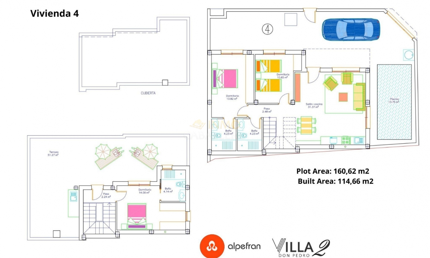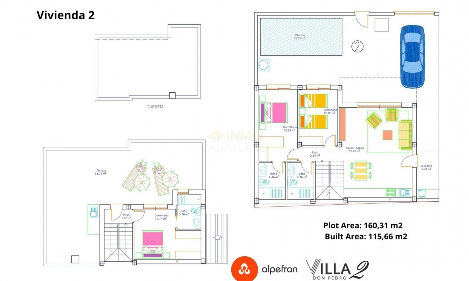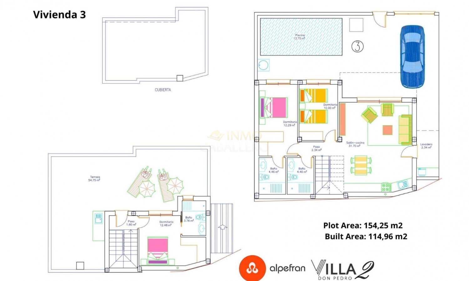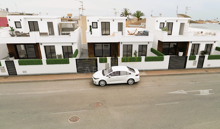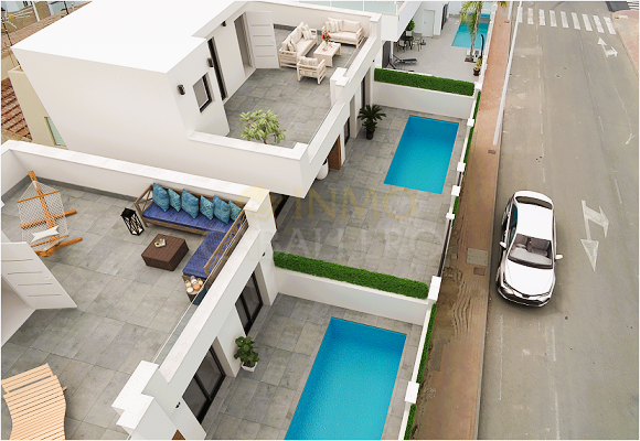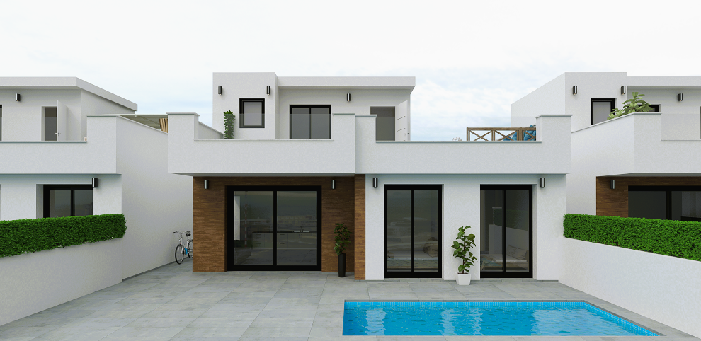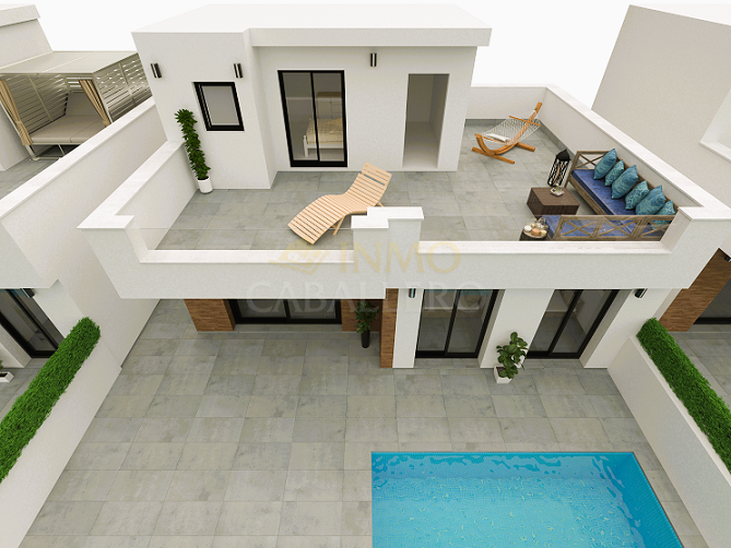 VILLAS DON PEDRO 2 besteht aus 4 Villen mit 3 Schlafzimmern und 3 Bädern mit privatem Pool und einem 54 m² großen Solarium. Es ist in einem modernen Stil und einem offenen Konzept gestaltet und umfasst ein Wohn-Esszimmer, eine voll ausgestattete Küche, zwei Schlafzimmer im Erdgeschoss (eines davon en suite) und zwei Badezimmer. Im Obergeschoss befindet sich ein Schlafzimmer mit Ankleidezimmer und eigenem Bad. Es hat auch Zugang zur großen Dachterrasse, um das ganze Jahr über die Sonne zu genießen. Im Garten befindet sich der 13,75 m² große Swimmingpool mit Terrasse und Platz für ein Auto. Das Anwesen befindet sich in San Pedro del Pinatar (Murcia), nur wenige Minuten vom Strand entfernt, umgeben von allen Dienstleistungen, Parks, Sportanlagen und mehreren Golfplätzen. VILLAS DON PEDRO 2 wird die höchsten Standards erfüllen und ausgestattet sein mit: Hochleistungs-Akustikdämmung an Dach und Wänden sowie wasserdichter Tischlerei und akustisch isolierenden Abschlusselementen. Außenschreinerei aus grauem Aluminium mit thermischer Trennung, Doppelverglasung und Verbundglas in den Fenstern bis zum Boden für optimalen Sonnenschutz. Schiebefenster im Esszimmer und in den Schlafzimmern; Dreh-Kipp-Fenster in den Bädern (Milchglas). Steinzeugböden im gesamten Haus im Format 60×60, auch auf den Terrassen. Verschiedene Formate und Auswahlmöglichkeiten. Weiß geflieste Badezimmer mit einer Auswahl an Duschbereichen. Badezimmermöbel, Spiegel und Licht über dem Waschbecken inklusive. Haushaltsgeräte inklusive: Kühl-Gefrierkombination, Herd, Backofen und Mikrowelle, Dunstabzugshaube und integrierter Geschirrspüler. Beleuchtung innerhalb und außerhalb des Hauses inklusive. Außer dekorative Lampen in Schlafzimmern und über dem Küchentisch. Privater Pool mit 2 Innenbeleuchtungen, Schalter im Esszimmer und Solardusche. Vorinstallation einer Abluftklimaanlage im Wohn- und Schlafzimmer. Fußgängertür mit Video-Gegensprechanlage und motorisierter Schiebetür für Fahrzeuge. Weiße, verstärkte Sicherheitstür. Erhältlich im Dezember 2025 ab 344.900 €
