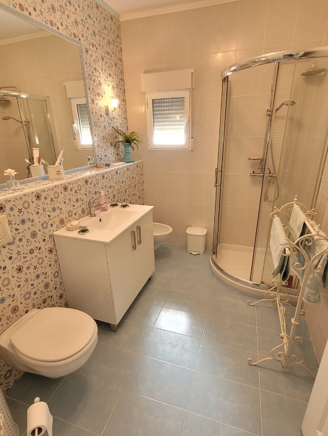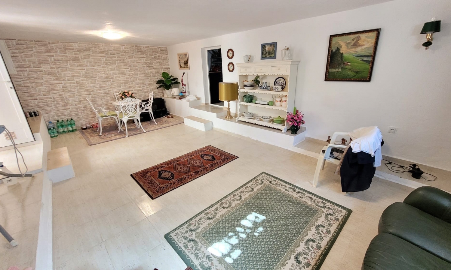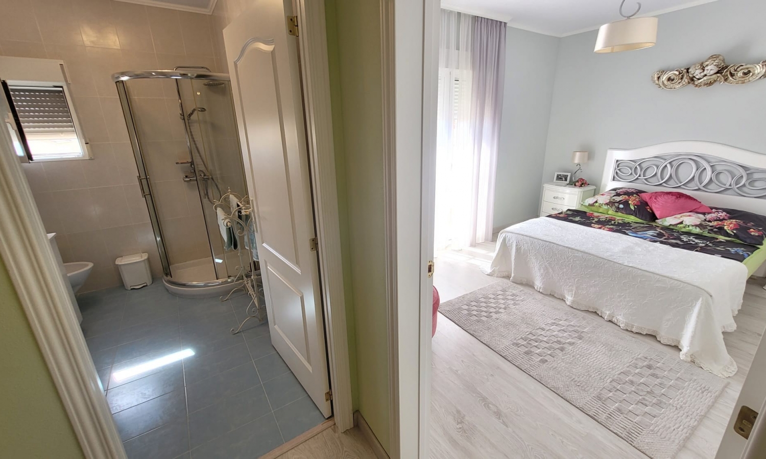 From the kitchen, a door leads to an internal staircase leading to the upper floor, also accessible from the outside and easily converted into a separate apartment. This floor includes a large bedroom with a balcony and built-in wardrobe, a bathroom, and a living-dining room with a balcony. This floor is pre-installed for heating.