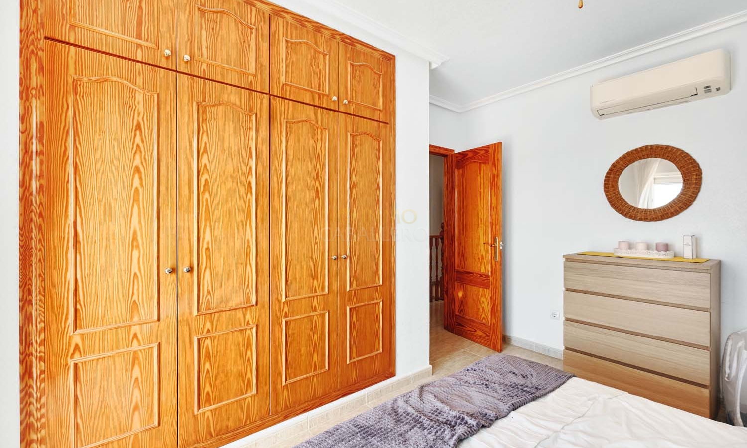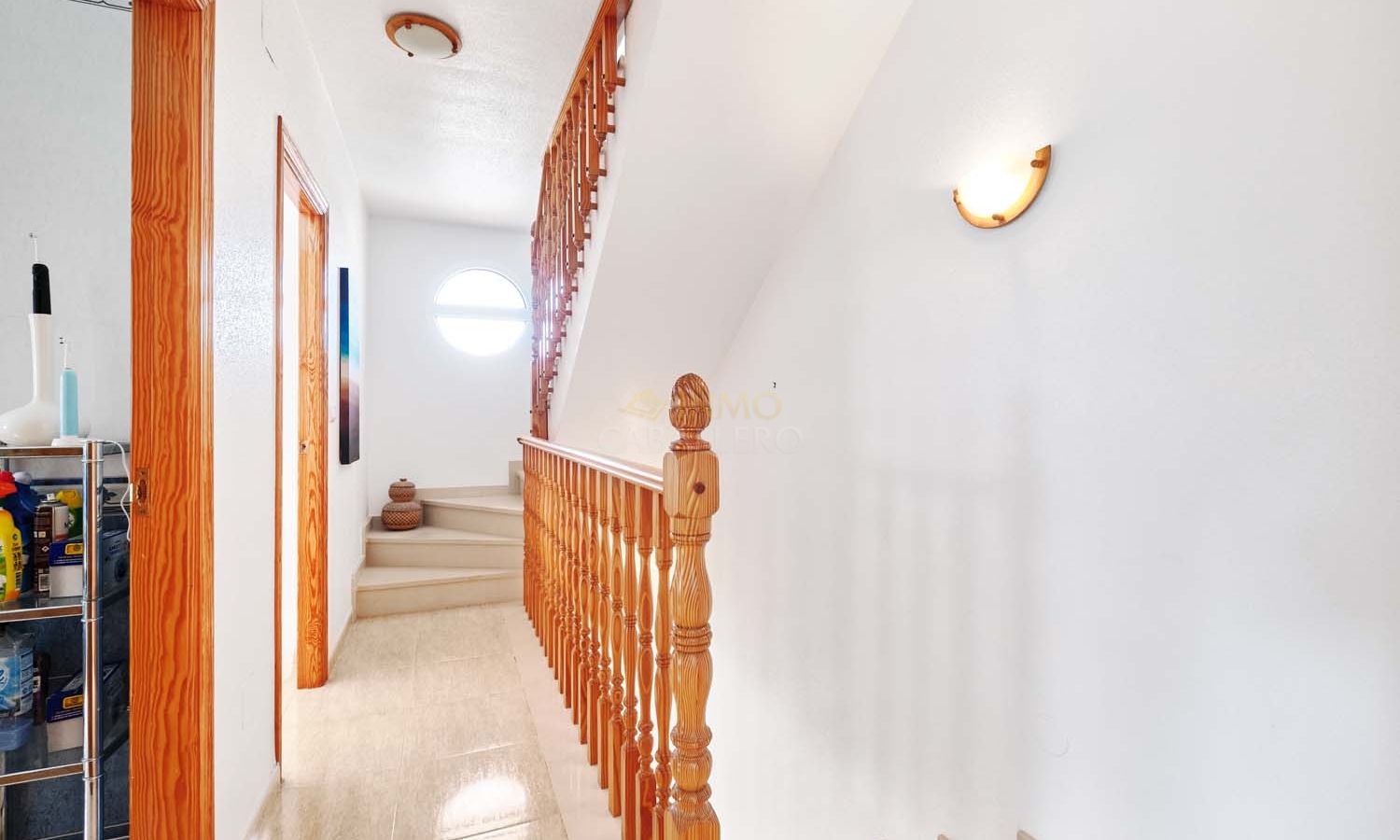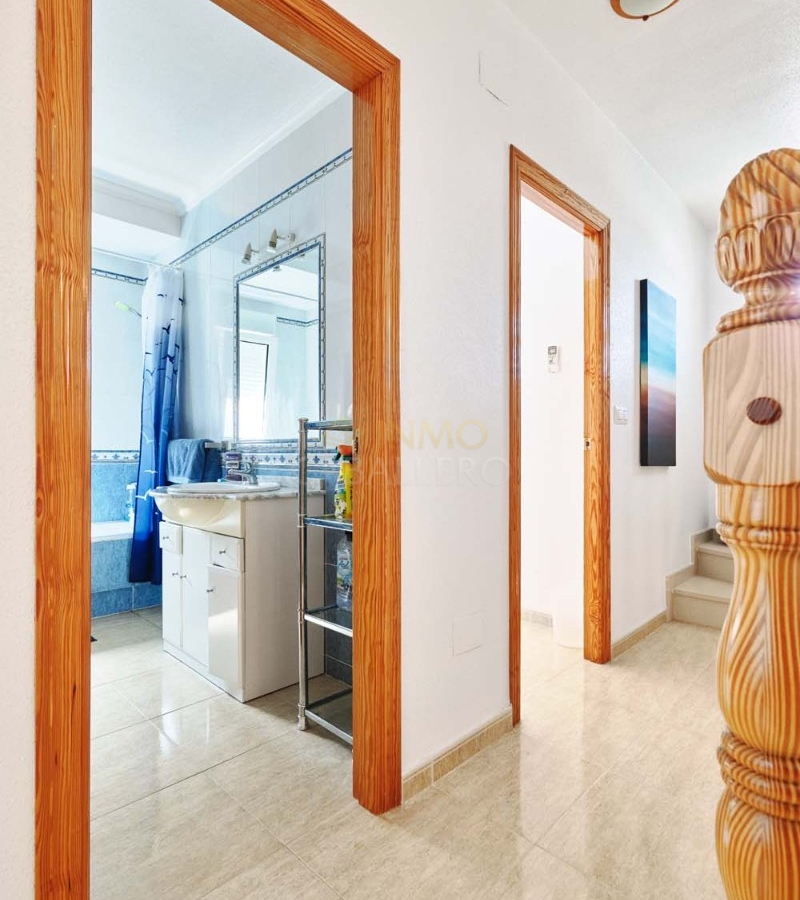 Upstairs the first room is a spacious double bedroom with built in wardrobes, next door is a large family bathroom with bath tub. To the other side of the bedroom is the master bedroom which is also spacious, has built in wardrobes and the additional bonus of patio doors giving access to a terrace with sun awning and boasting countryside and distant sea views. Both upstairs bedrooms are fitted with hot/cold air conditioning. A further internal staircase gives access to a loft space for storage and a door leading to a roof terrace with countryside and distant sea views.