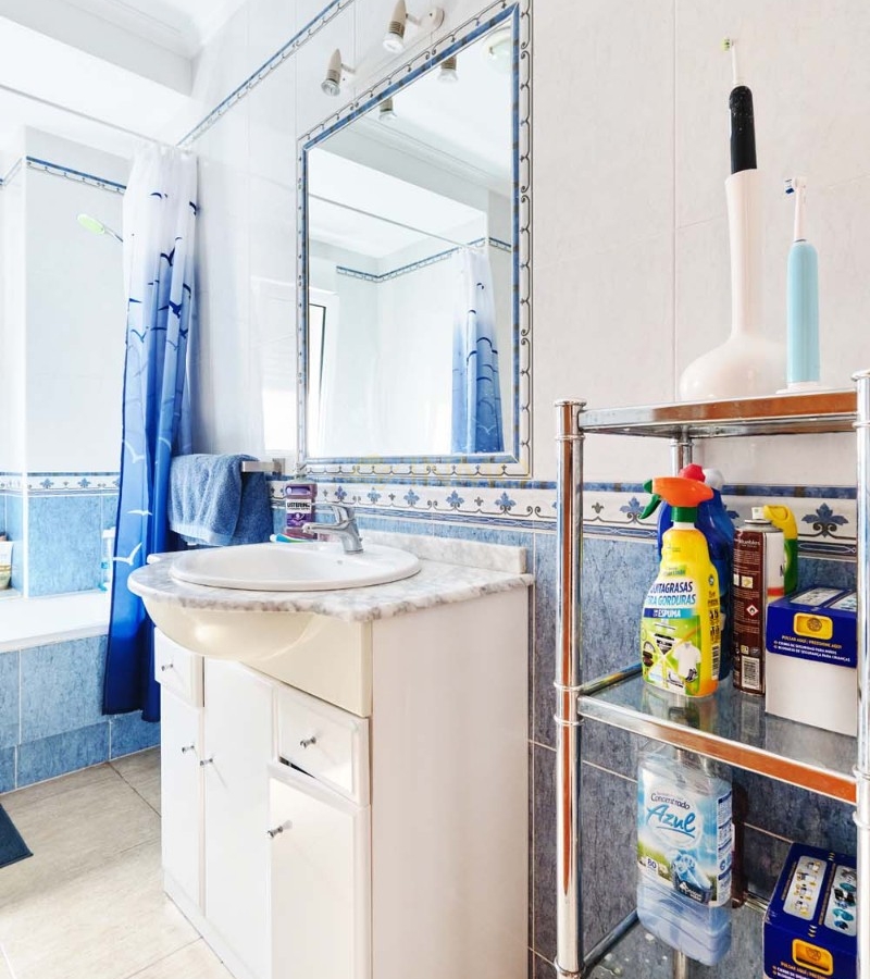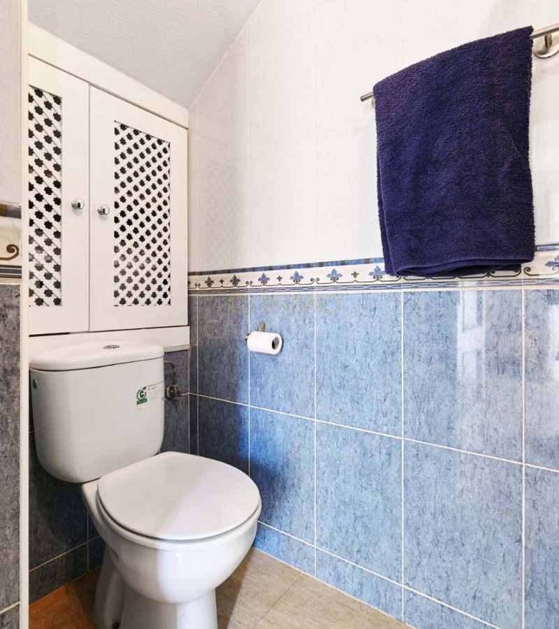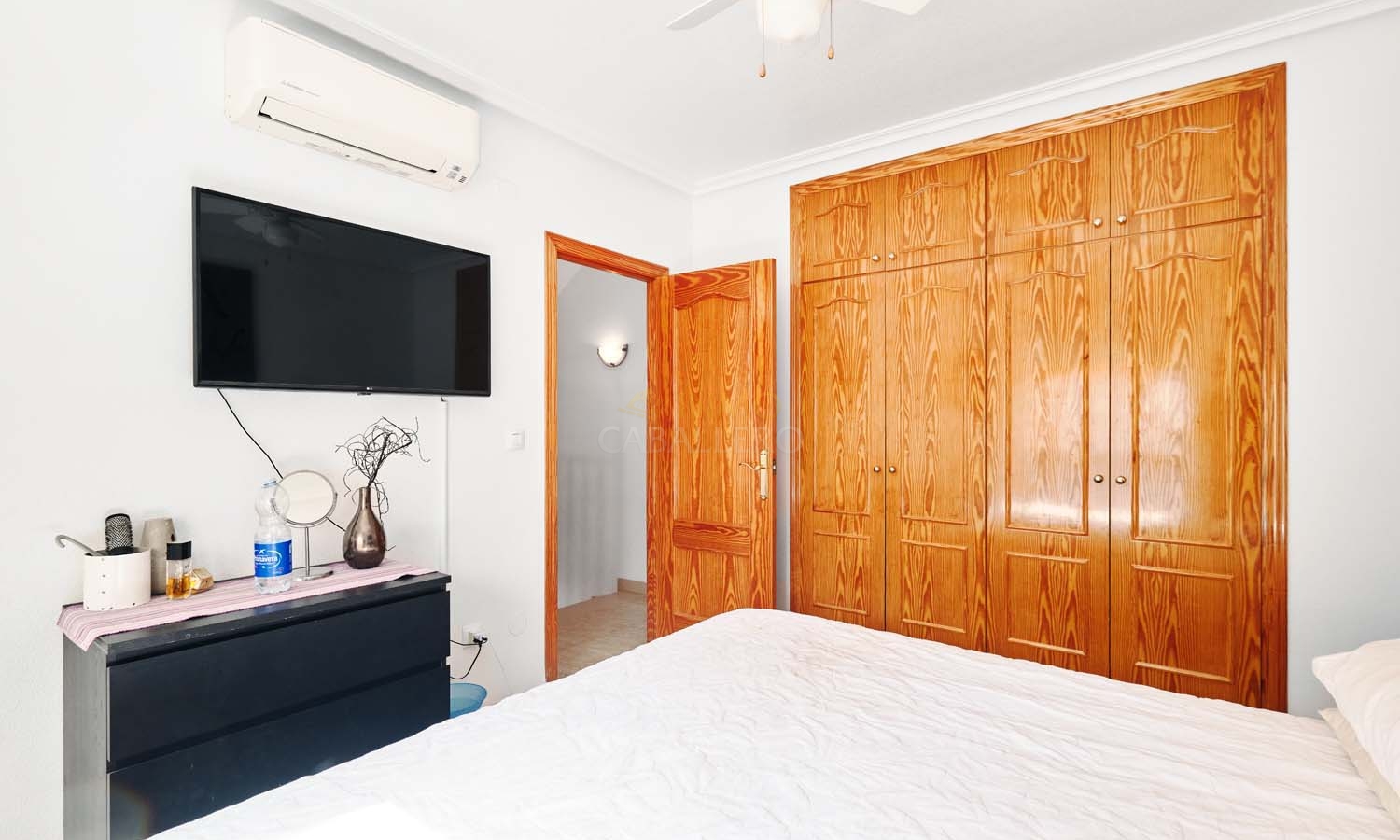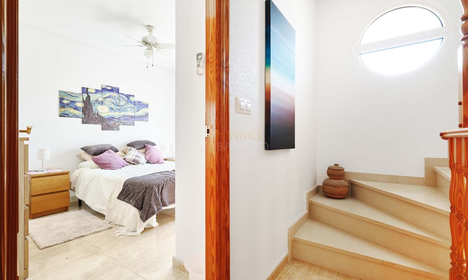 Upstairs the first room is a spacious double bedroom with built in wardrobes, next door is a large family bathroom with bath tub. To the other side of the bedroom is the master bedroom which is also spacious, has built in wardrobes and the additional bonus of patio doors giving access to a terrace with sun awning and boasting countryside and distant sea views. Both upstairs bedrooms are fitted with hot/cold air conditioning. A further internal staircase gives access to a loft space for storage and a door leading to a roof terrace with countryside and distant sea views.