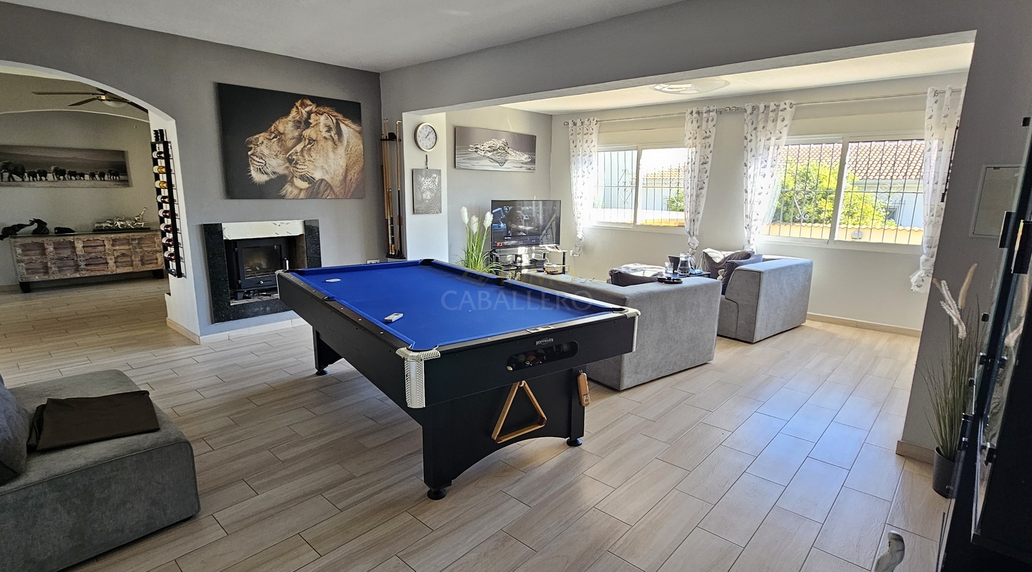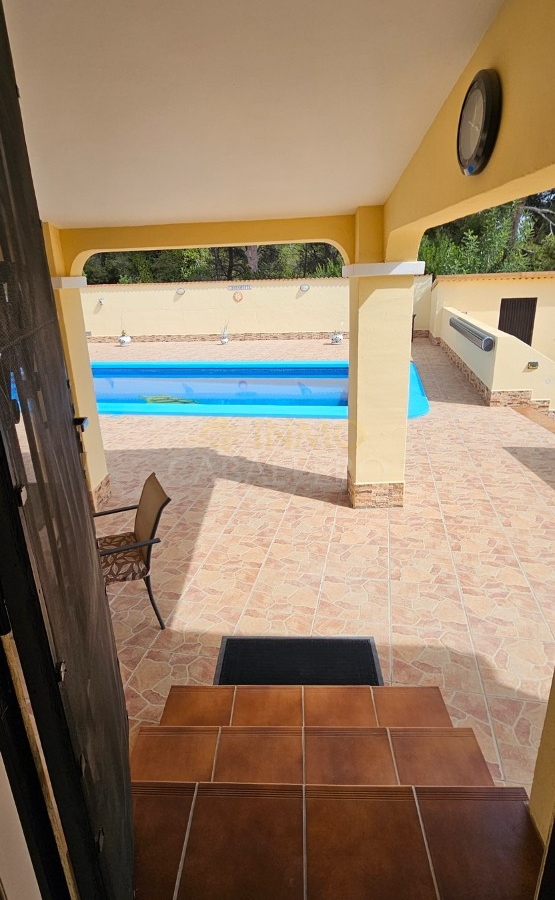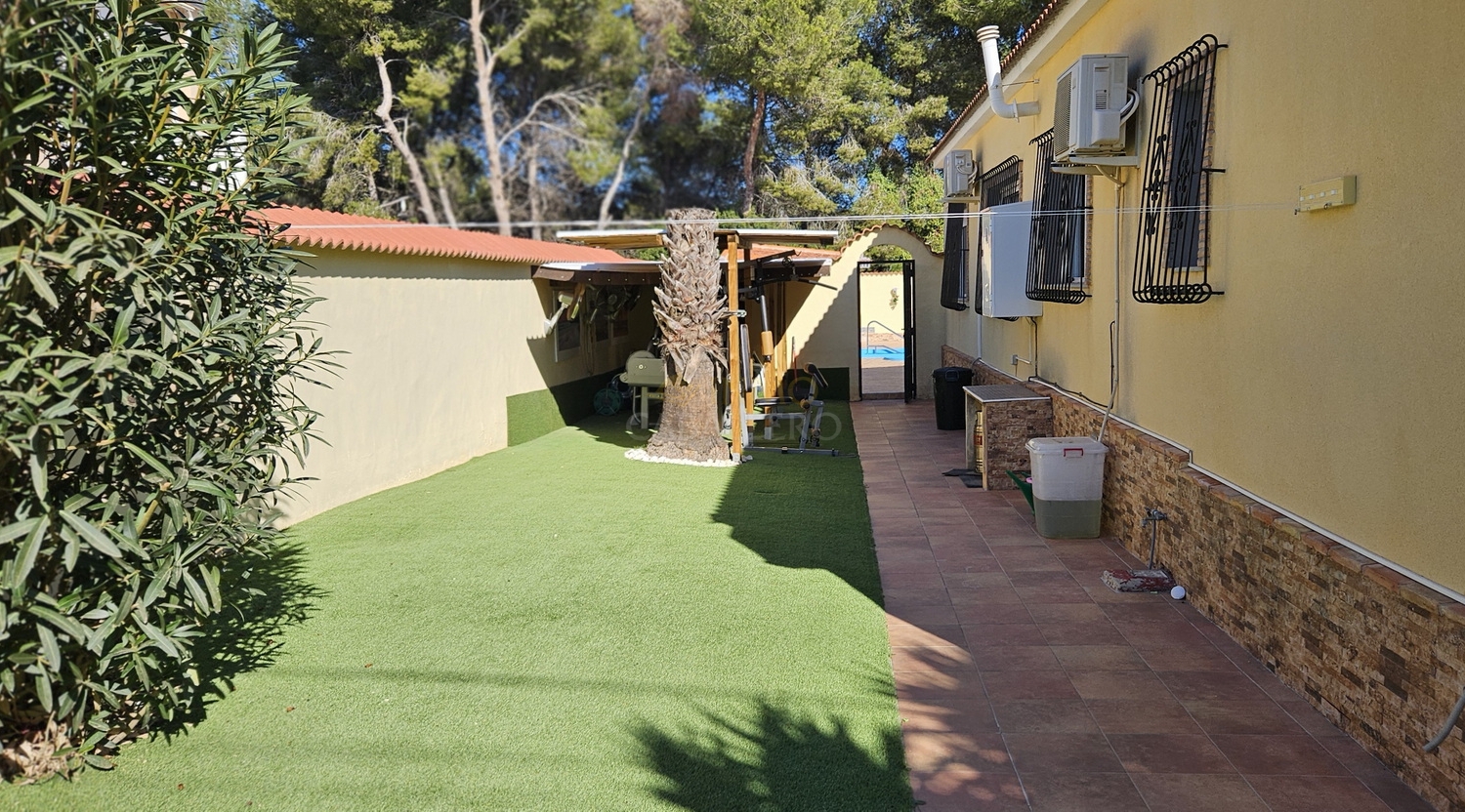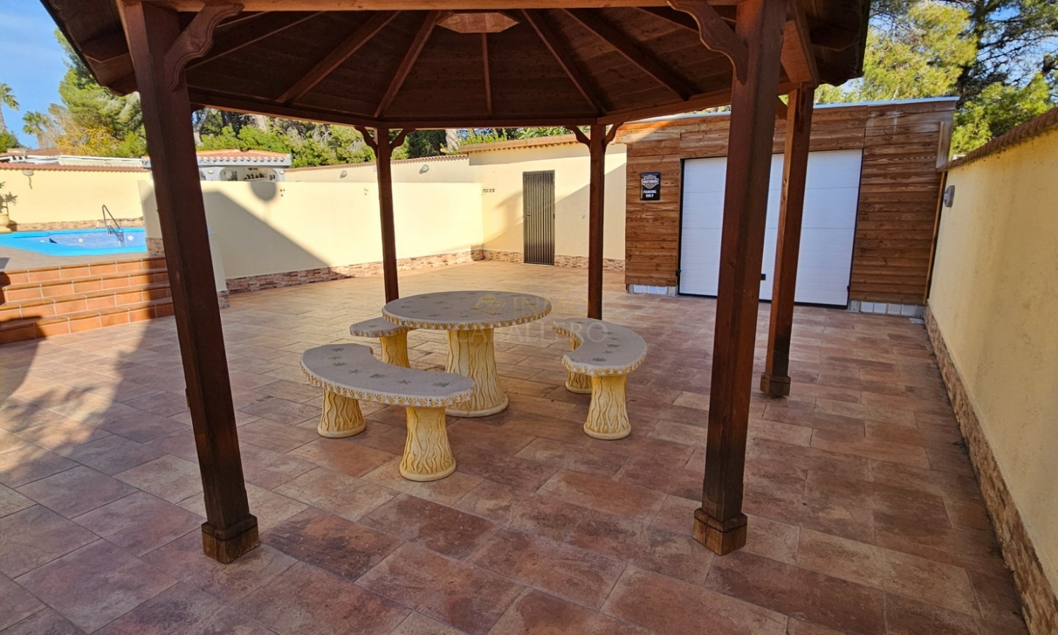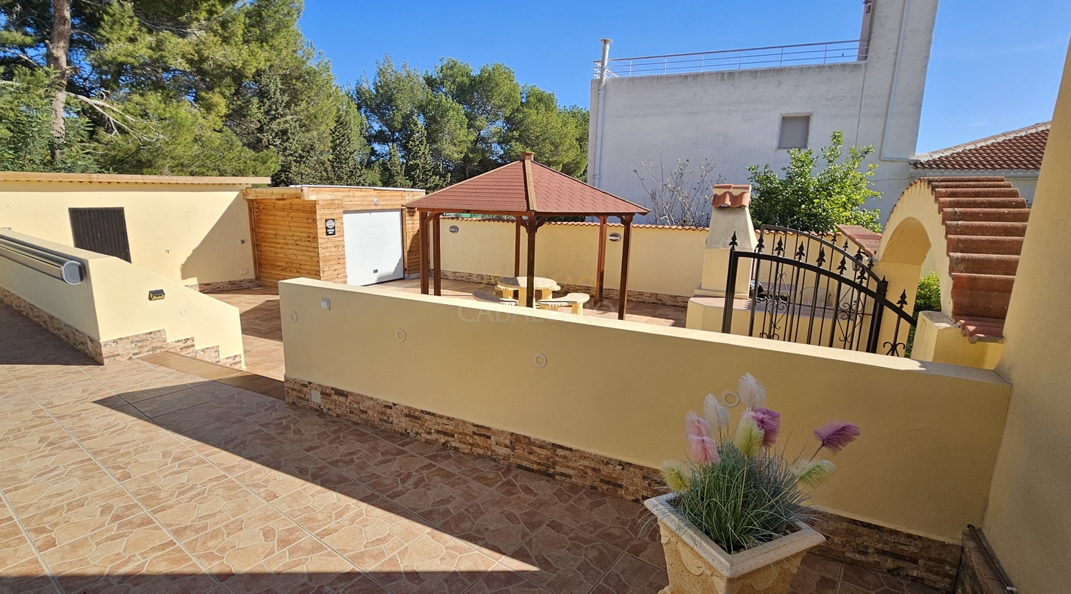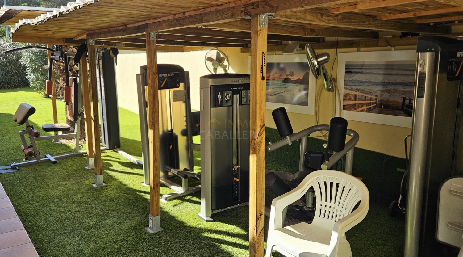 Outside, the property offers parking space for several vehicles, a covered carport for two cars, a gym, barbecue area, wooden shed, swimming pool, covered terrace and a large terrace surrounding the pool.