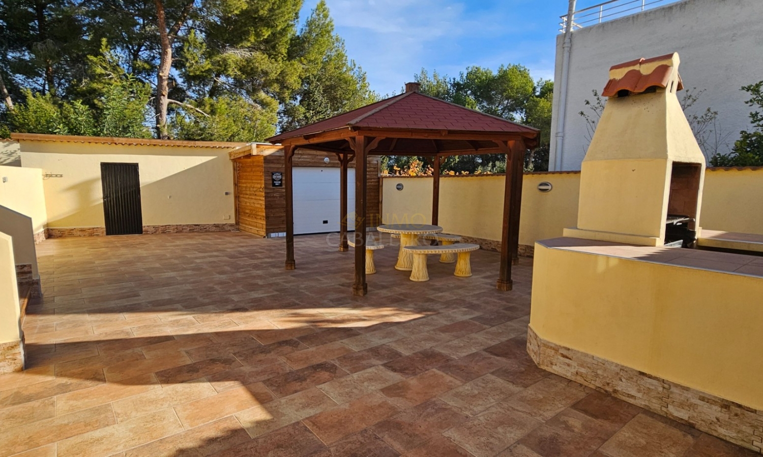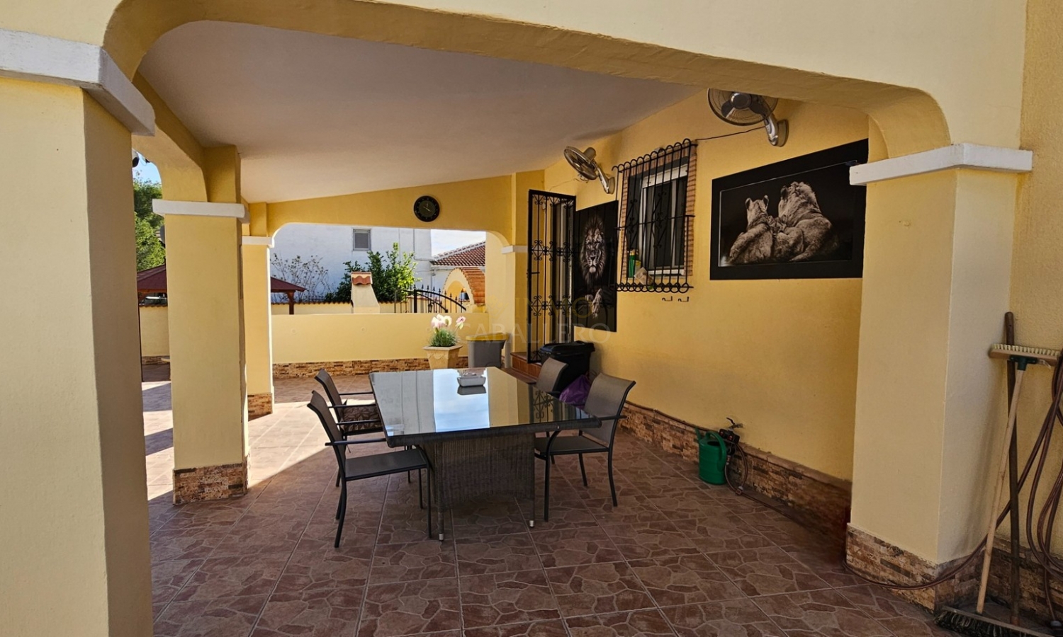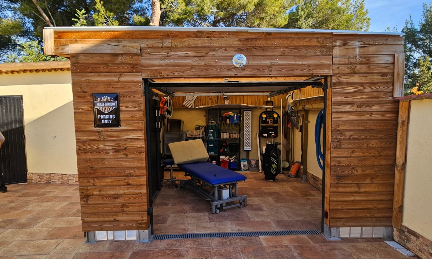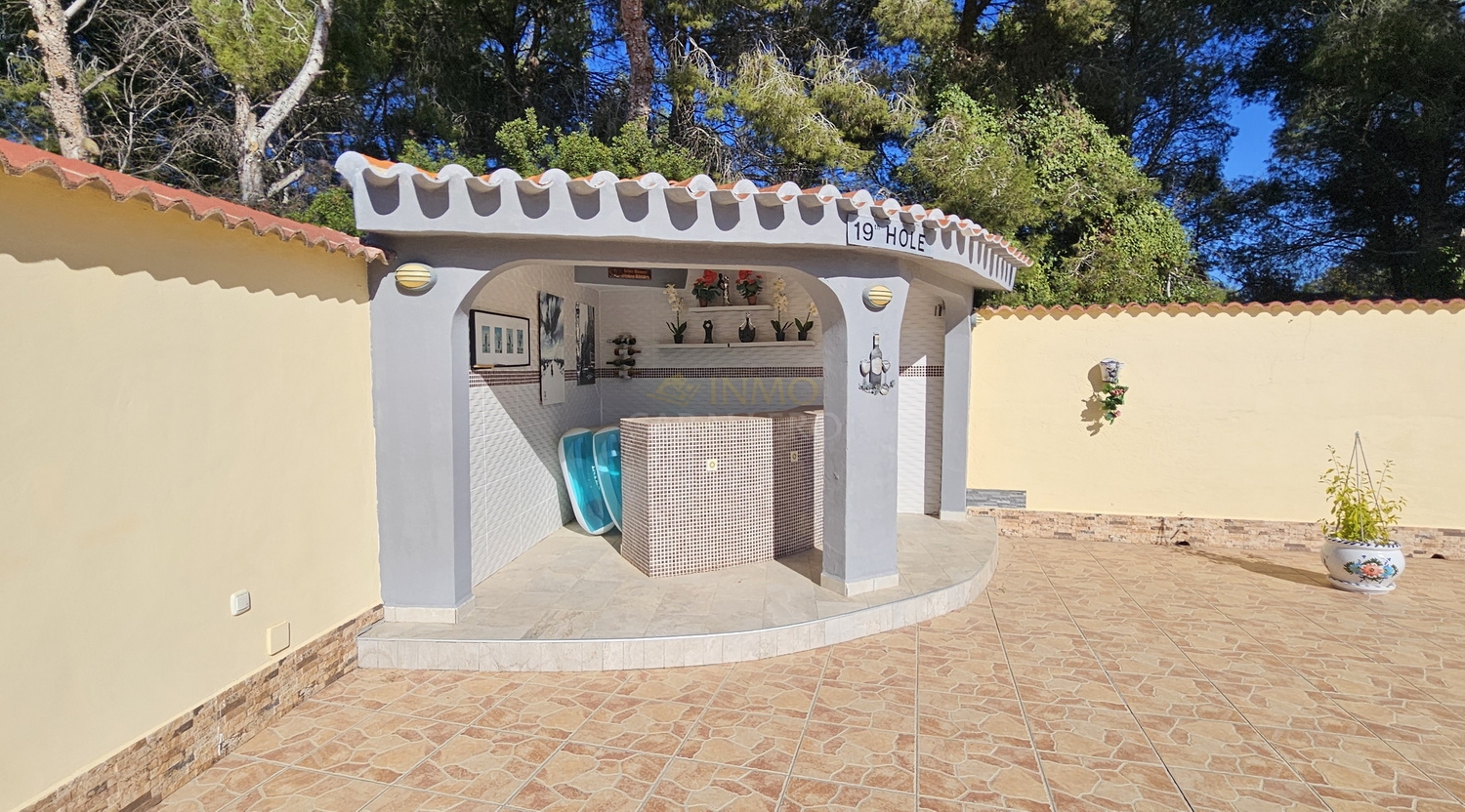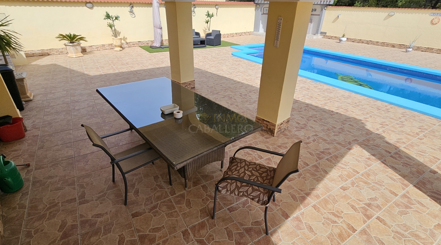 Outside, the property offers parking space for several vehicles, a covered carport for two cars, a gym, barbecue area, wooden shed, swimming pool, covered terrace and a large terrace surrounding the pool.