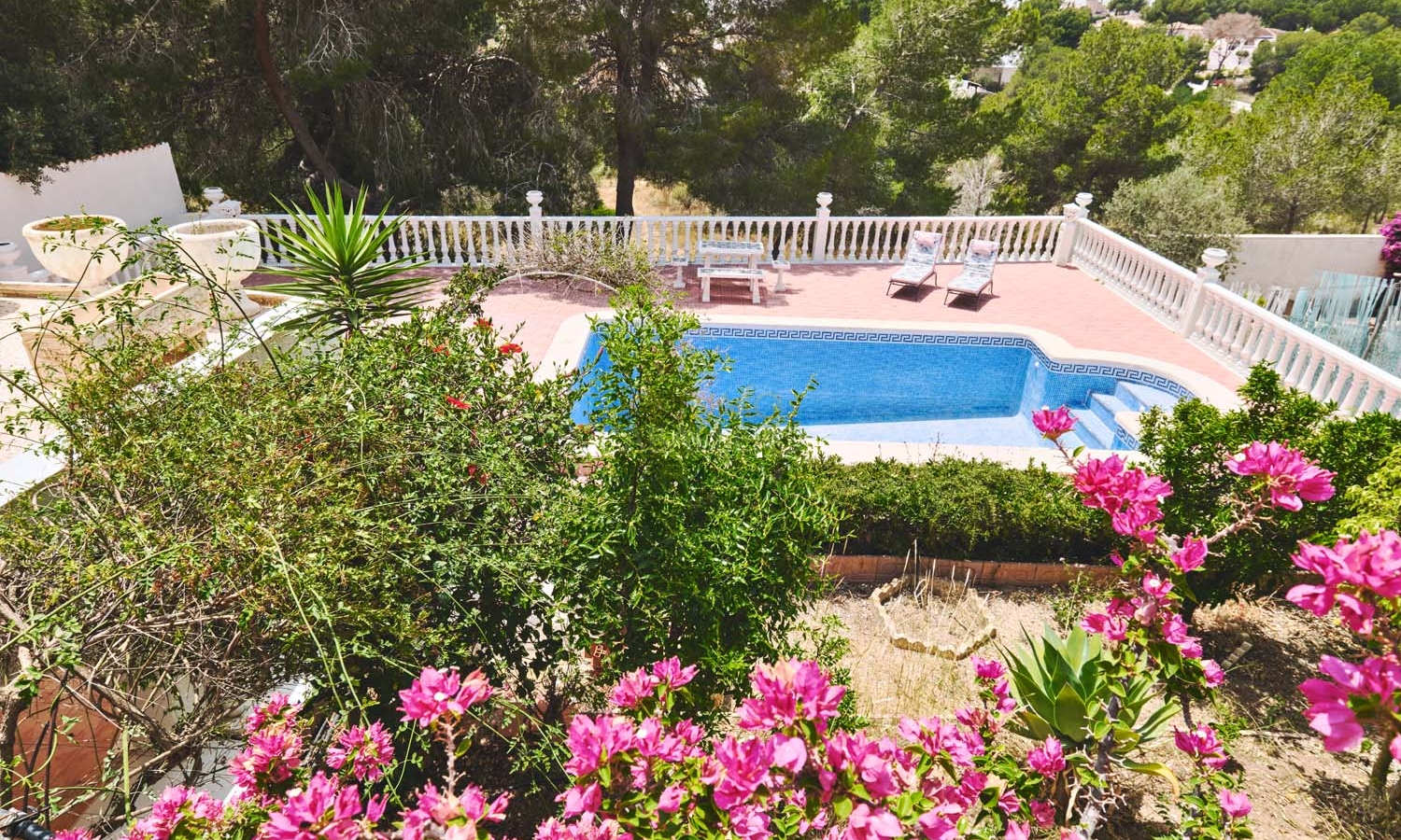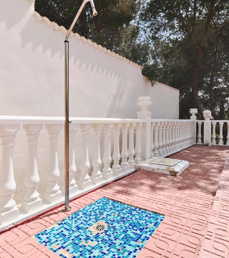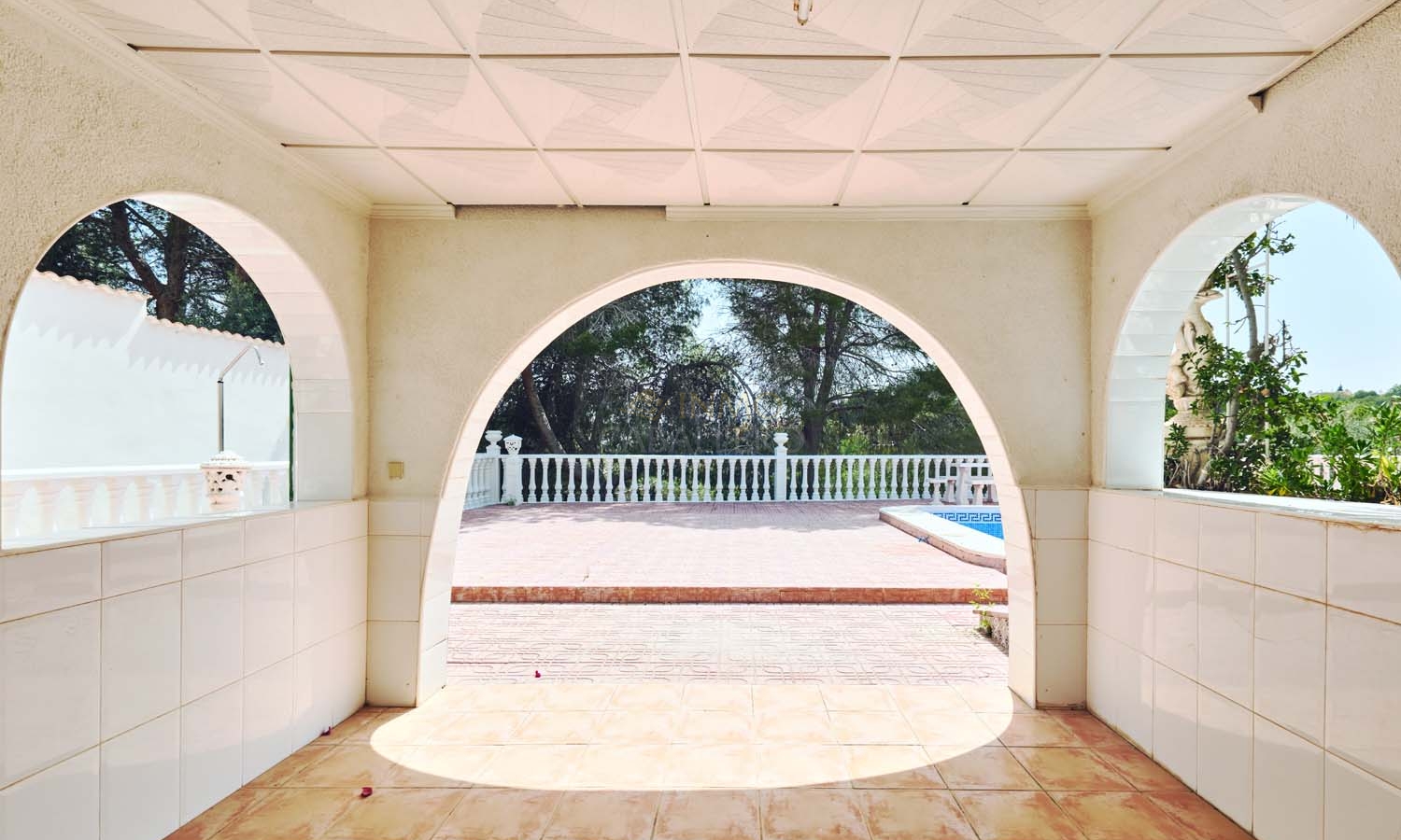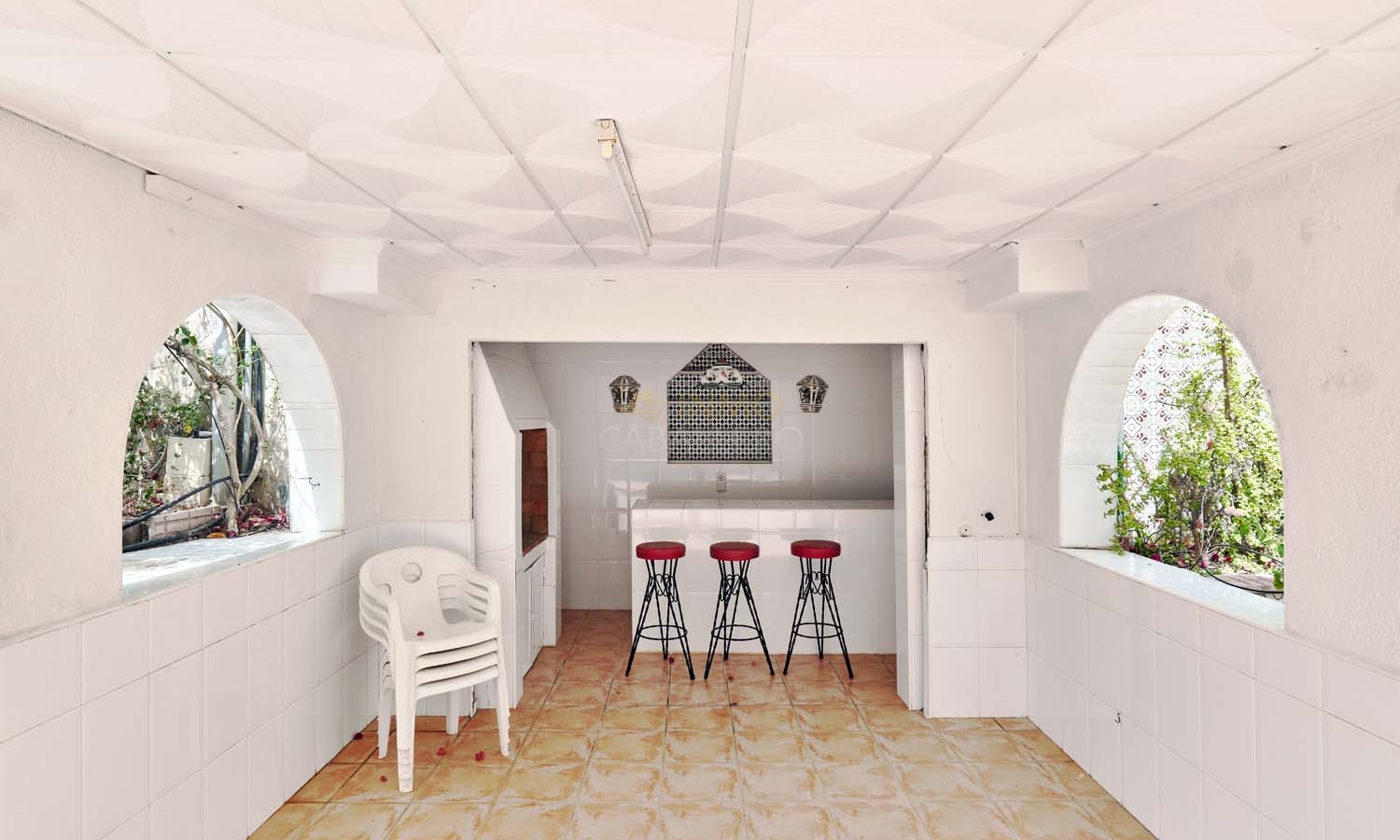 Quelques marches sur le côté de la villa mènent à la piscine, située à l'arrière du terrain et donnant sur l'espace vert. Un portail vous y donne directement accès. La piscine est entièrement carrelée et dispose d'un bar extérieur avec barbecue en briques et d'un coin salon couvert. Cet espace est idéal pour recevoir ou passer la journée au bord de la piscine en famille ou entre amis. Un grand débarras est situé sous la piscine et le propriétaire vendra la propriété meublée.