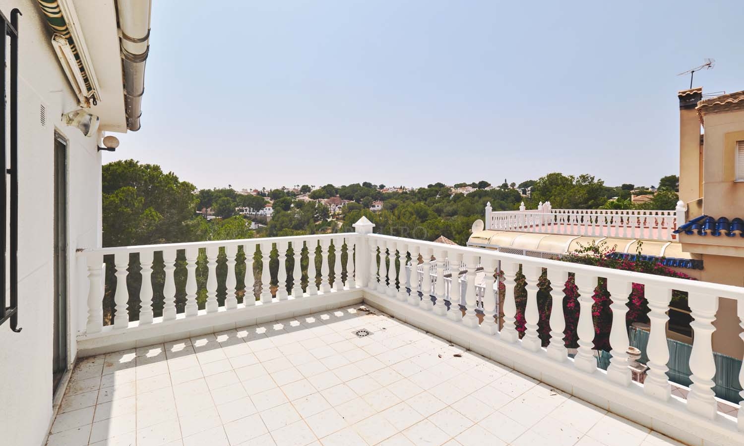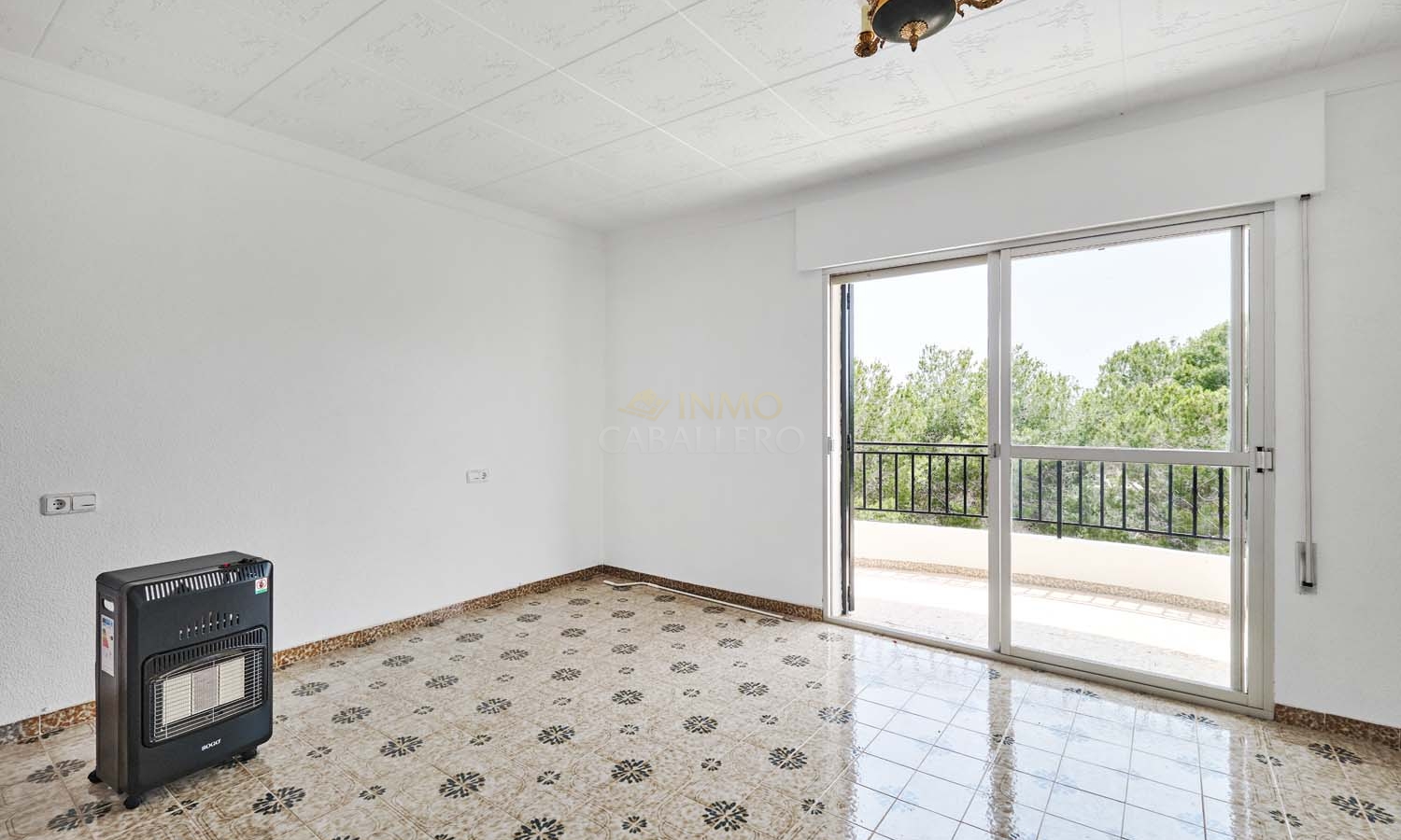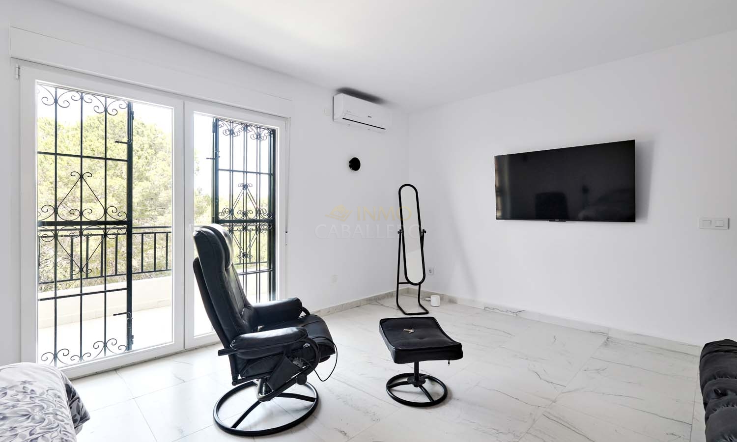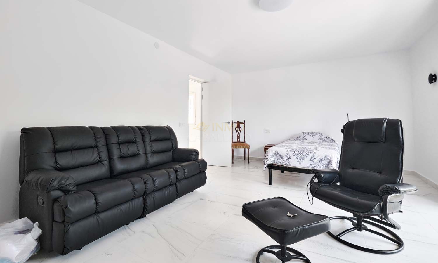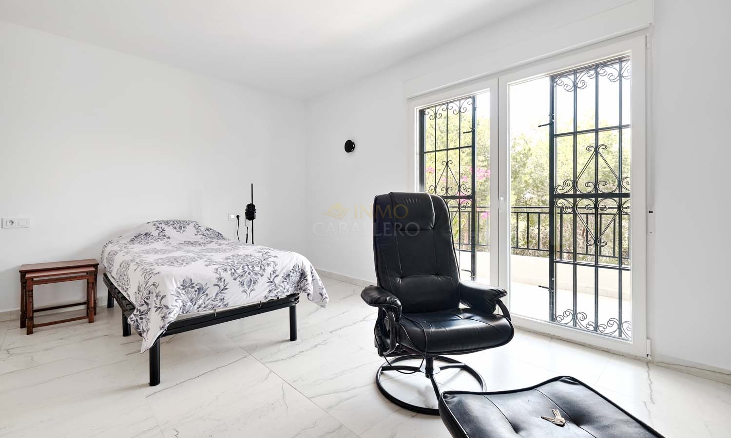 Un escalier extérieur, à l'avant de la villa, mène au dernier étage de la propriété et à la seconde moitié de l'espace de vie. Cet espace est idéal pour les visiteurs car il peut être fermé à clé lorsqu'il n'est pas utilisé, tout en offrant à chacun un grand espace avec son propre accès indépendant. Le dernier étage comprend une pièce vitrée à l'avant donnant sur le jardin, un spacieux séjour, une grande cuisine séparée entièrement équipée, une salle de bain familiale, une chambre double et une petite chambre simple, comme au rez-de-chaussée. À l'arrière de la propriété se trouve une autre grande chambre principale avec portes-fenêtres donnant sur une terrasse offrant une jolie vue sur la campagne. Une seconde porte mène également à une autre terrasse avec store.