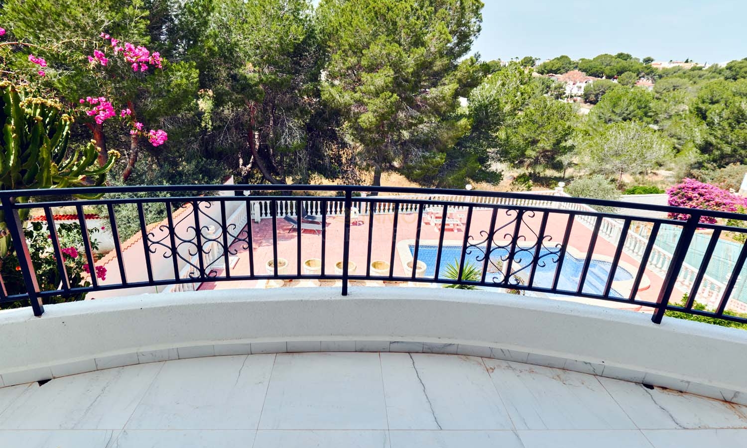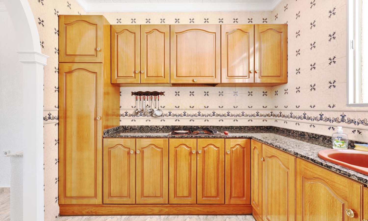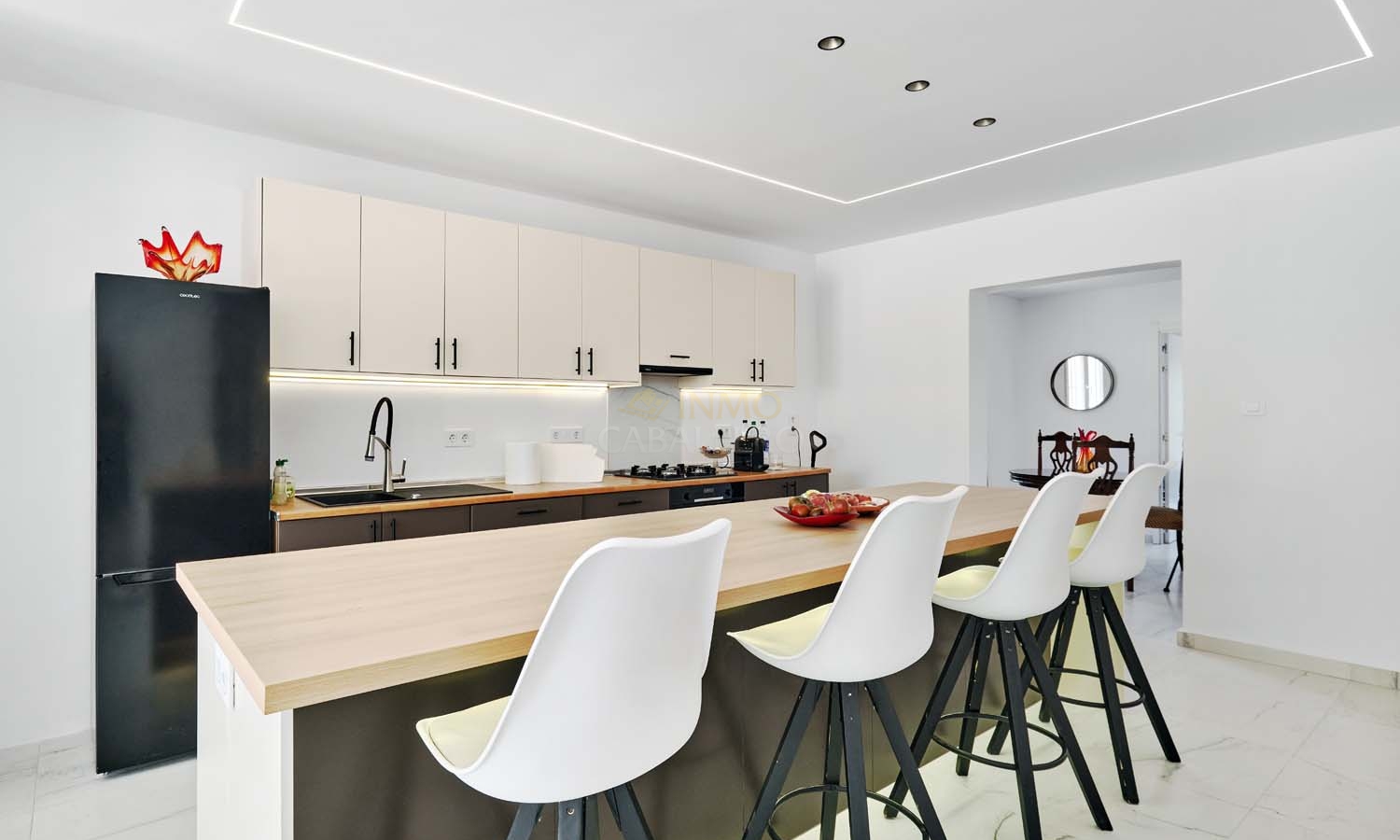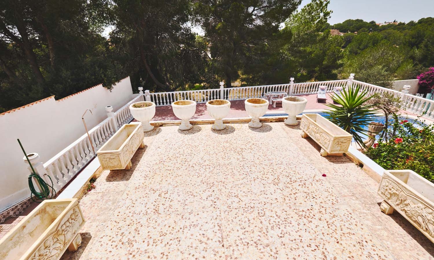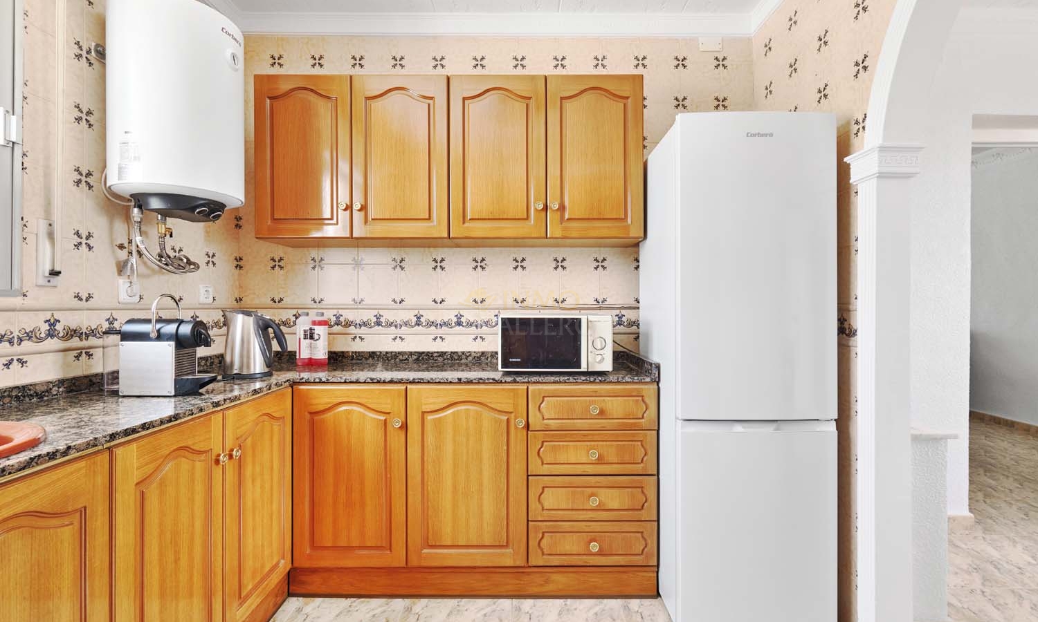 Un escalier extérieur, à l'avant de la villa, mène au dernier étage de la propriété et à la seconde moitié de l'espace de vie. Cet espace est idéal pour les visiteurs car il peut être fermé à clé lorsqu'il n'est pas utilisé, tout en offrant à chacun un grand espace avec son propre accès indépendant. Le dernier étage comprend une pièce vitrée à l'avant donnant sur le jardin, un spacieux séjour, une grande cuisine séparée entièrement équipée, une salle de bain familiale, une chambre double et une petite chambre simple, comme au rez-de-chaussée. À l'arrière de la propriété se trouve une autre grande chambre principale avec portes-fenêtres donnant sur une terrasse offrant une jolie vue sur la campagne. Une seconde porte mène également à une autre terrasse avec store.