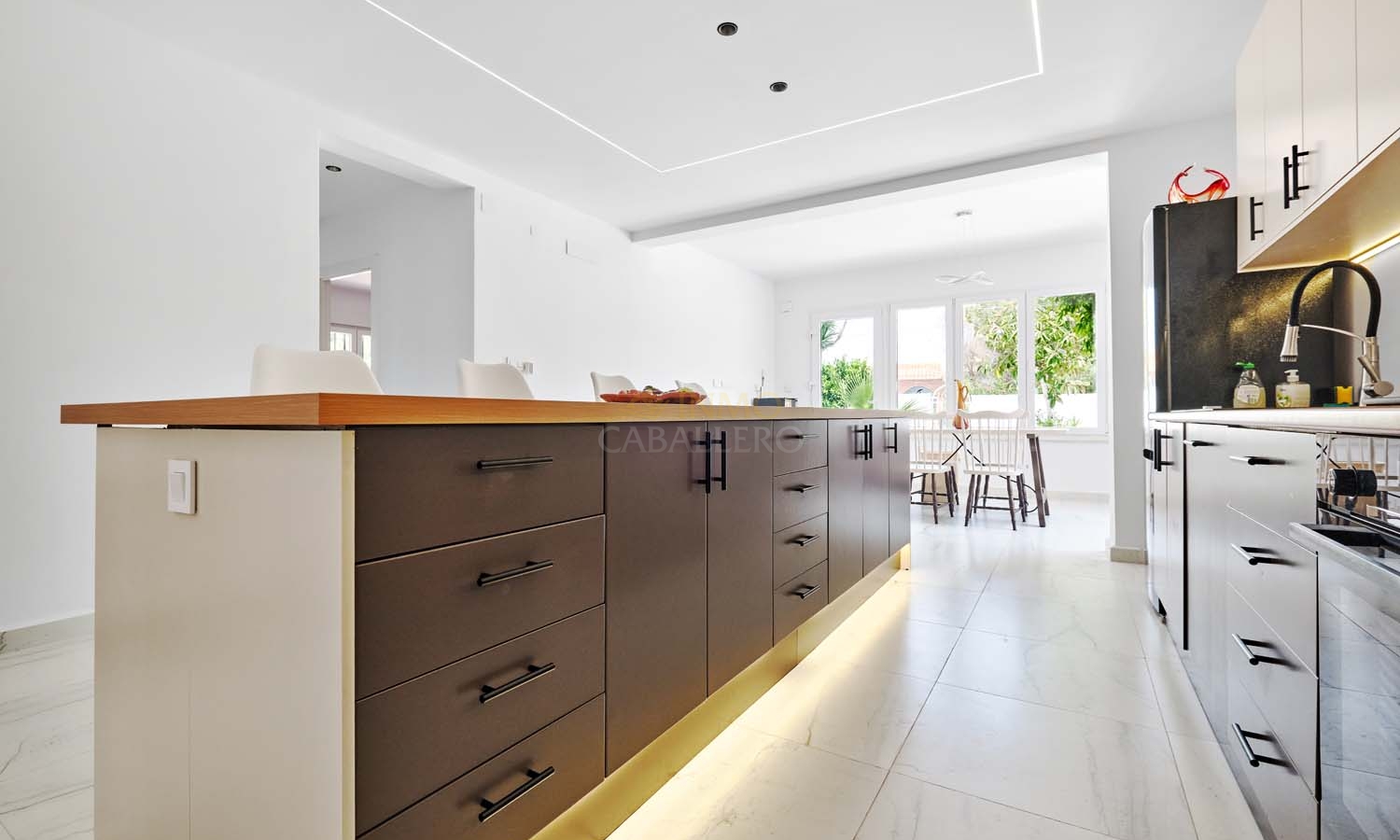 Au rez-de-chaussée, accessible par une porte vitrée, vous trouverez une spacieuse et lumineuse cuisine ouverte et une salle à manger récemment installées. Cet espace constitue le cœur de la maison avec son grand îlot central idéal pour les repas, le travail ou les réceptions. À droite de la cuisine, un couloir dessert une grande chambre, une salle de bain familiale et une deuxième chambre plus petite pouvant également servir de bureau ou de dressing. À l'arrière de la cuisine se trouve un séjour offrant un espace repas généreux. Une porte mène du séjour à une jolie terrasse couverte sur le côté du terrain. Une seconde porte mène à la grande chambre principale. Climatisée, elle est baignée de lumière par des portes-fenêtres qui s'ouvrent sur une terrasse donnant sur l'espace vert.