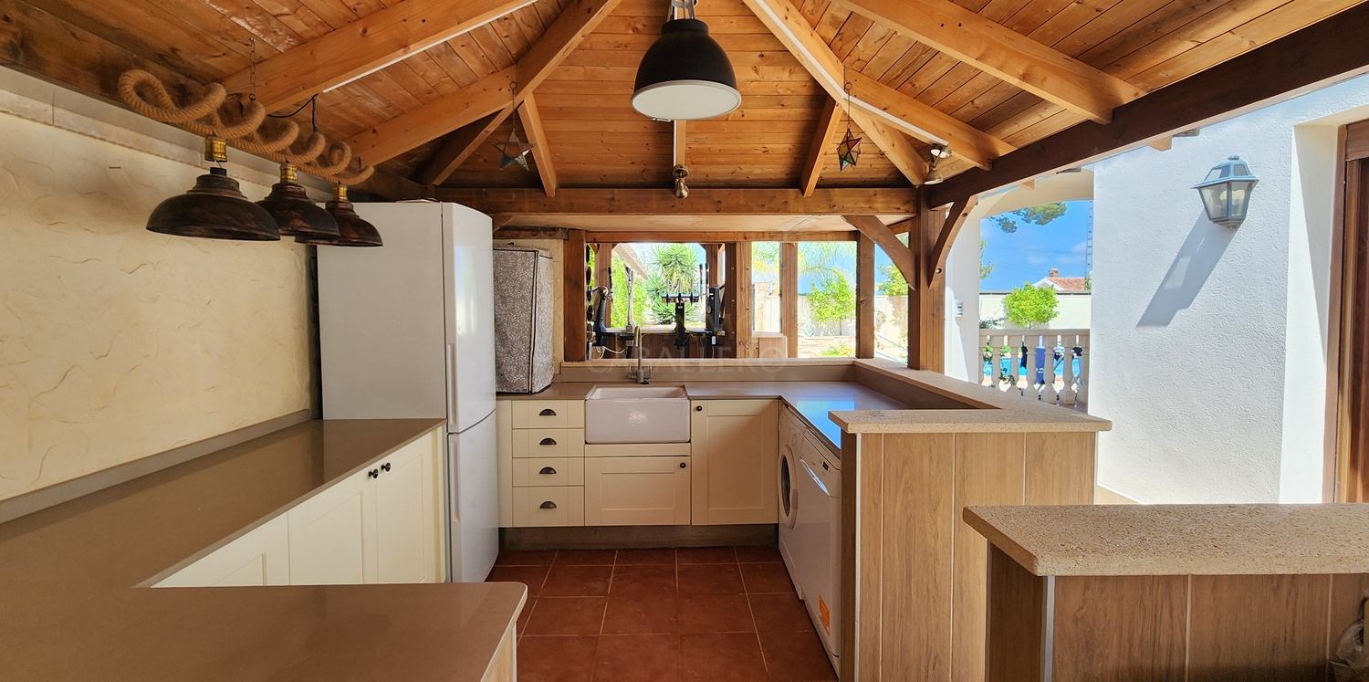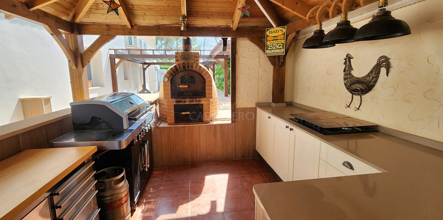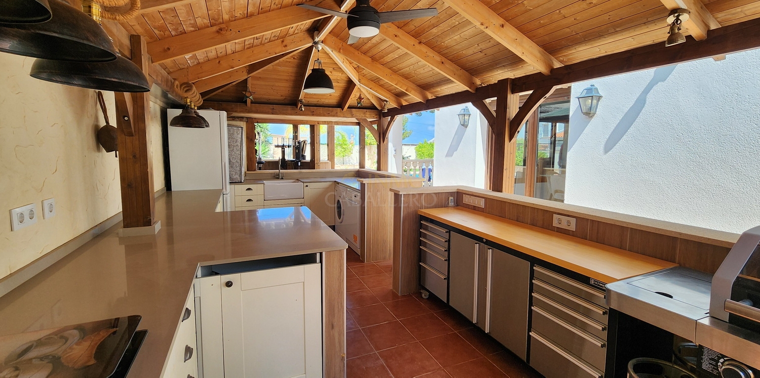 L'extérieur de la propriété impressionne par son aménagement : abri voiture couvert, débarras, toilettes, jardin arboré offrant une grande intimité, grande piscine privée ensoleillée toute la journée et offrant un espace généreux pour les chaises longues et les espaces détente, douche extérieure, cascade, bar, barbecue et cuisine extérieure entièrement équipée.