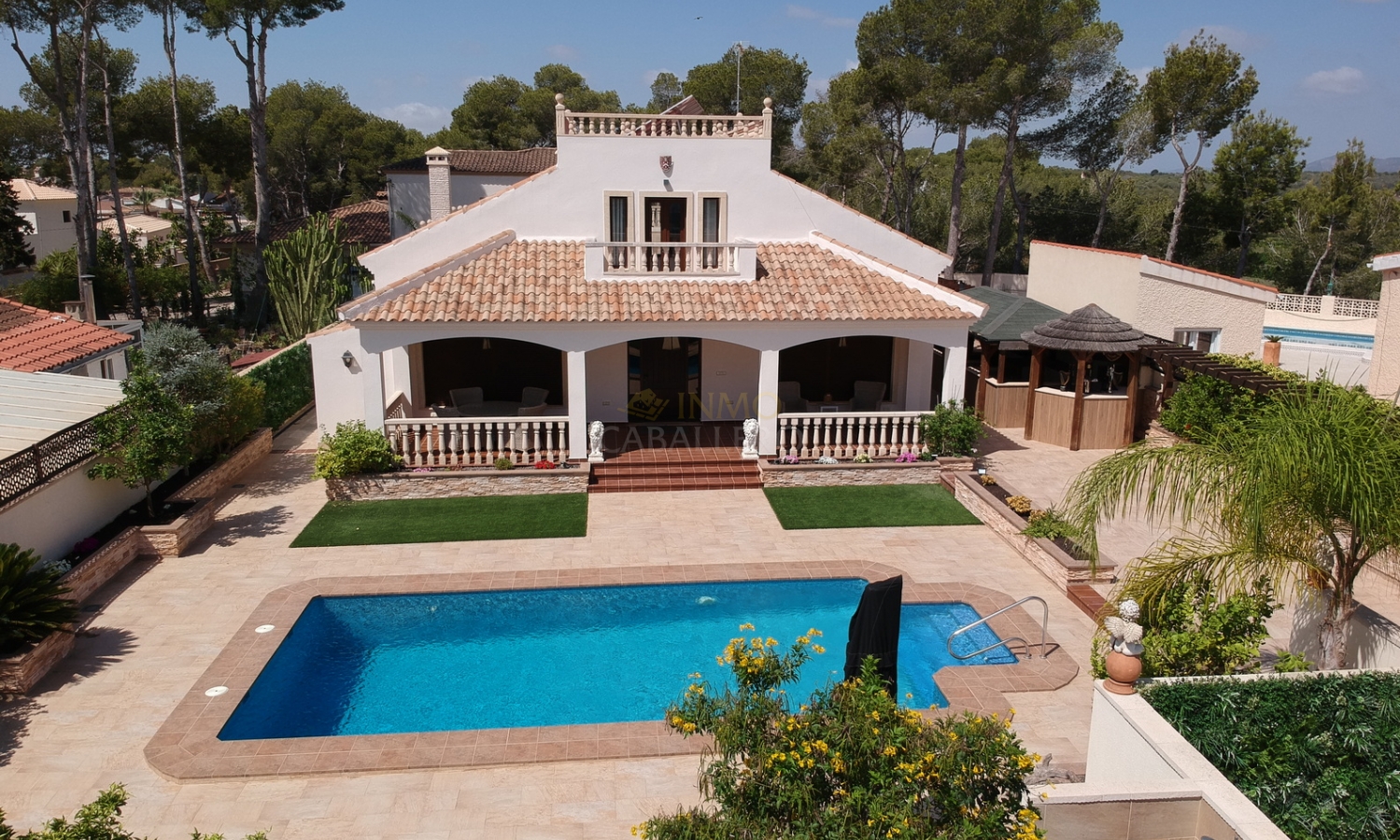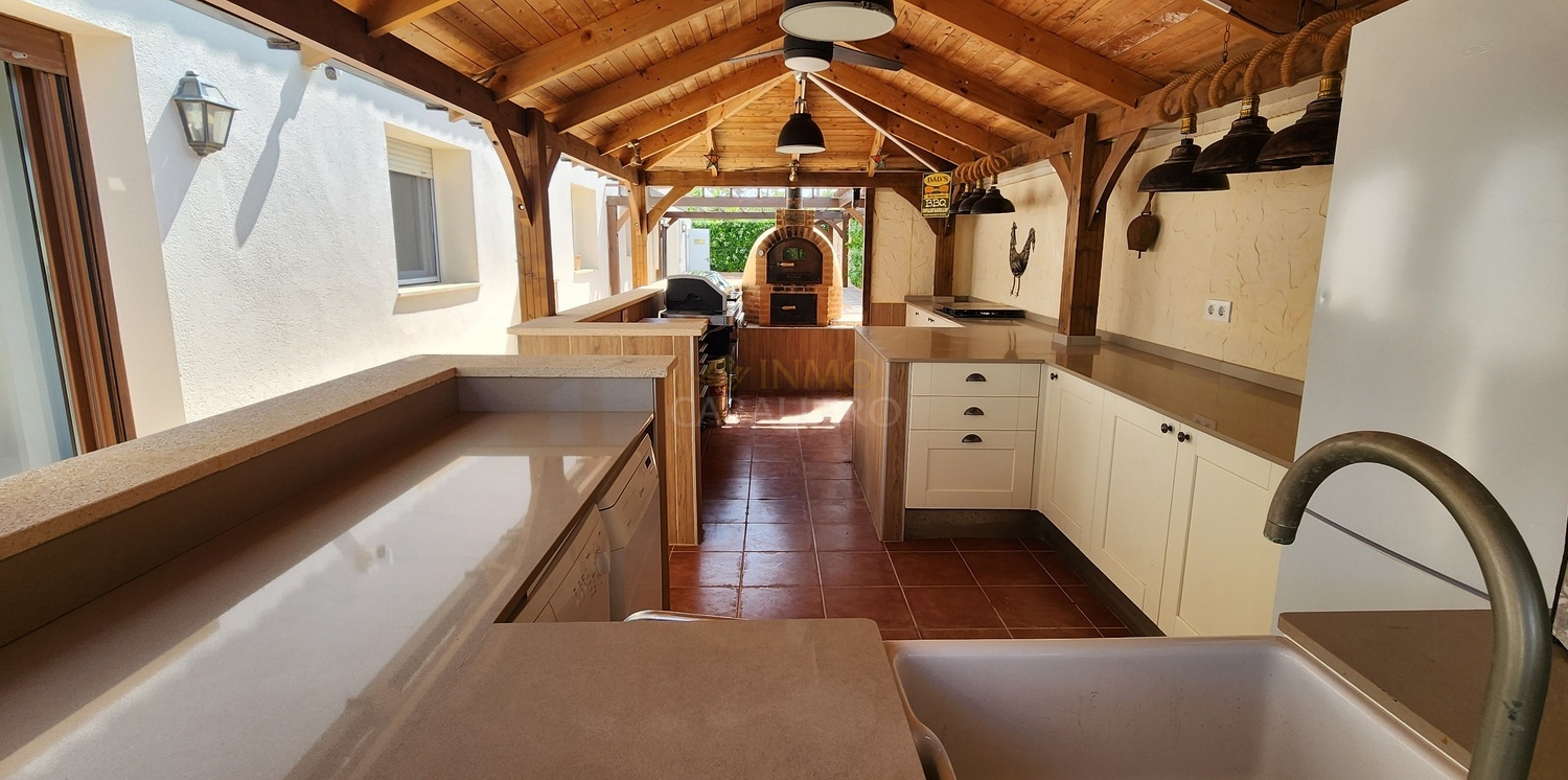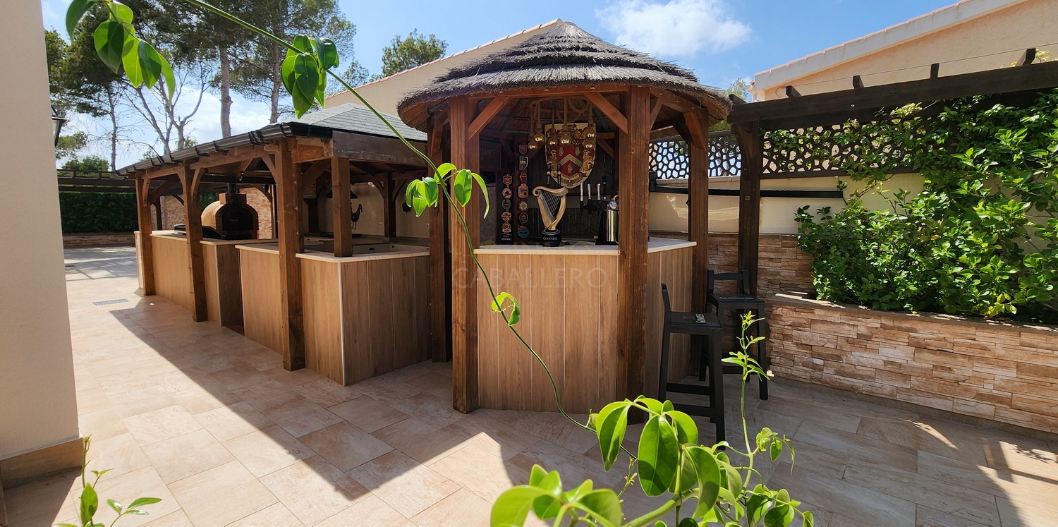 L'extérieur de la propriété impressionne par son aménagement : abri voiture couvert, débarras, toilettes, jardin arboré offrant une grande intimité, grande piscine privée ensoleillée toute la journée et offrant un espace généreux pour les chaises longues et les espaces détente, douche extérieure, cascade, bar, barbecue et cuisine extérieure entièrement équipée.