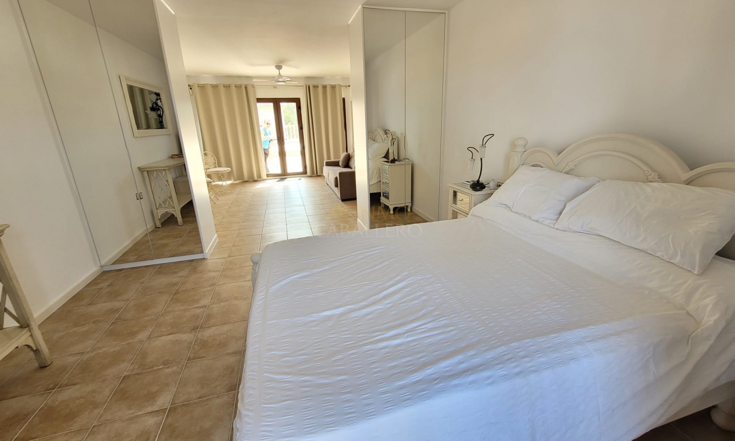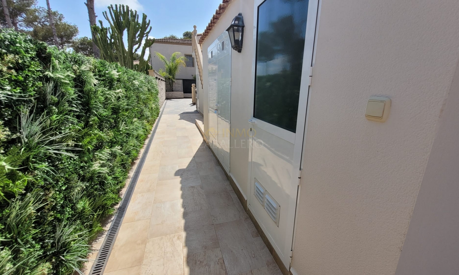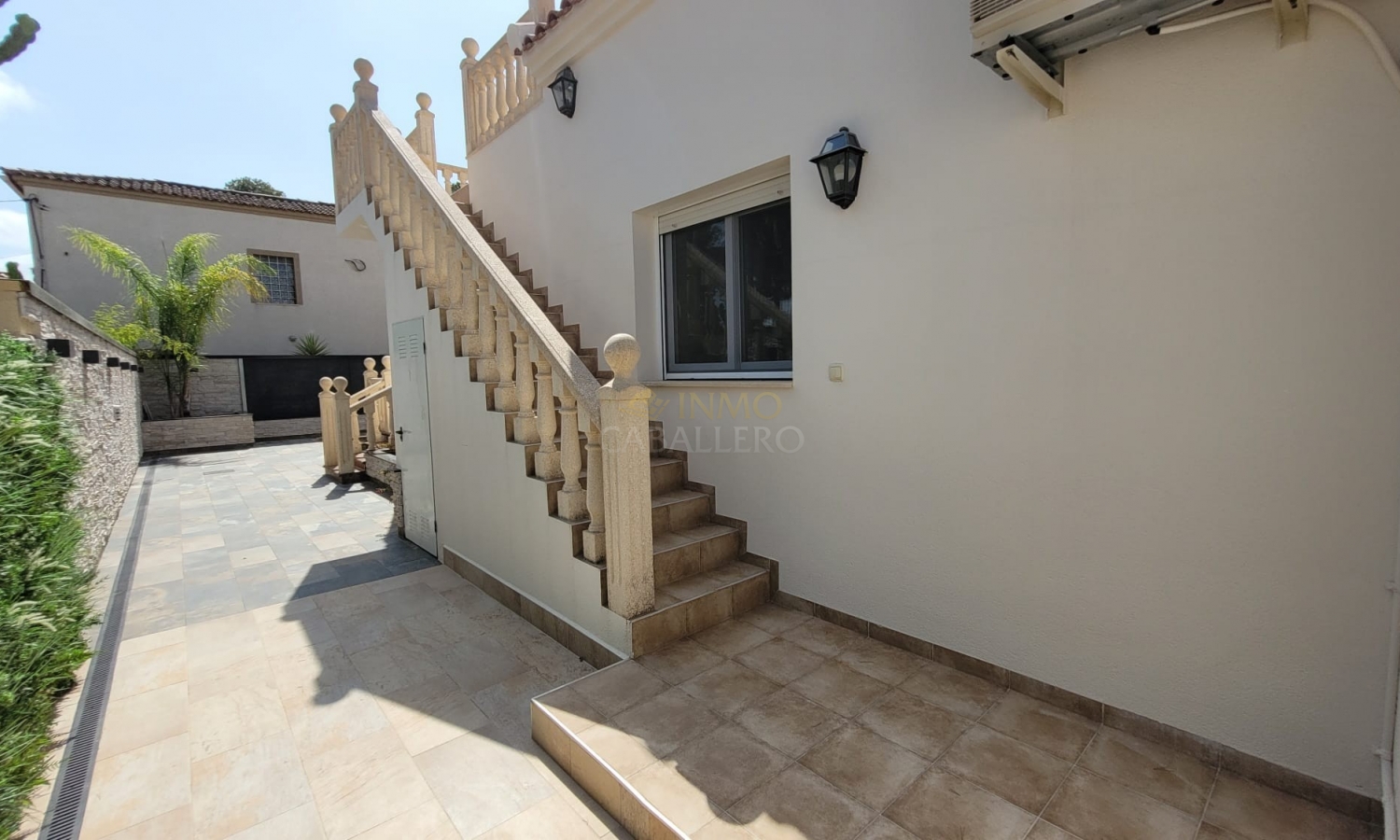 On accède à la maison principale par un charmant porche voûté qui mène à un spacieux séjour. À droite se trouvent la salle à manger avec accès au jardin et la cuisine entièrement équipée. Un couloir dessert deux chambres avec placards intégrés, chacune avec salle de bain attenante, des toilettes invités, un bureau (pouvant servir de chambre) avec accès à une terrasse et salle de bain attenante, la chambre principale avec accès à une terrasse, salle de bain attenante et dressing, ainsi qu'une buanderie donnant sur une terrasse.
