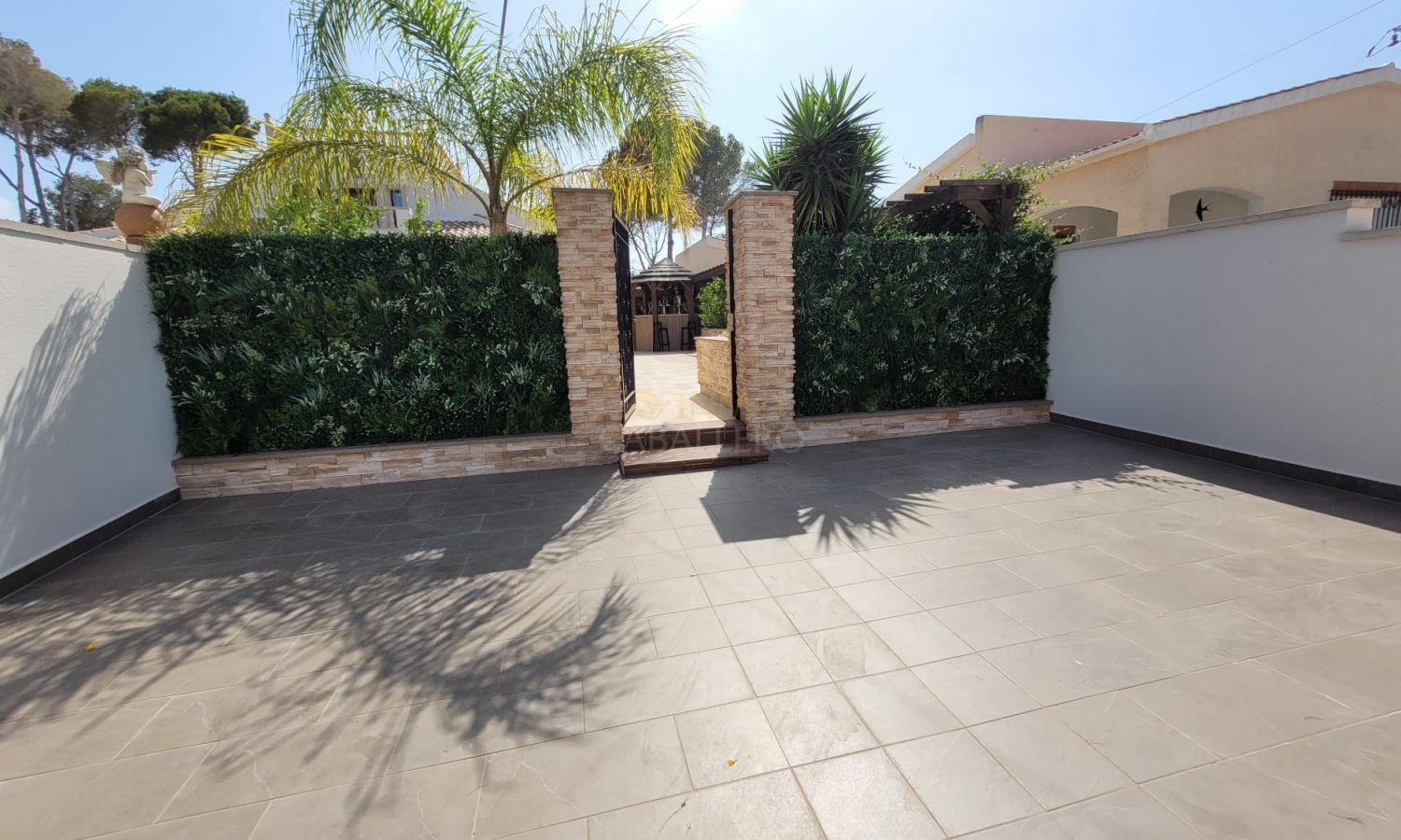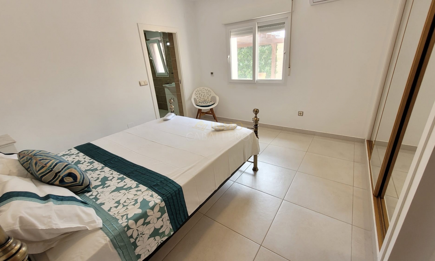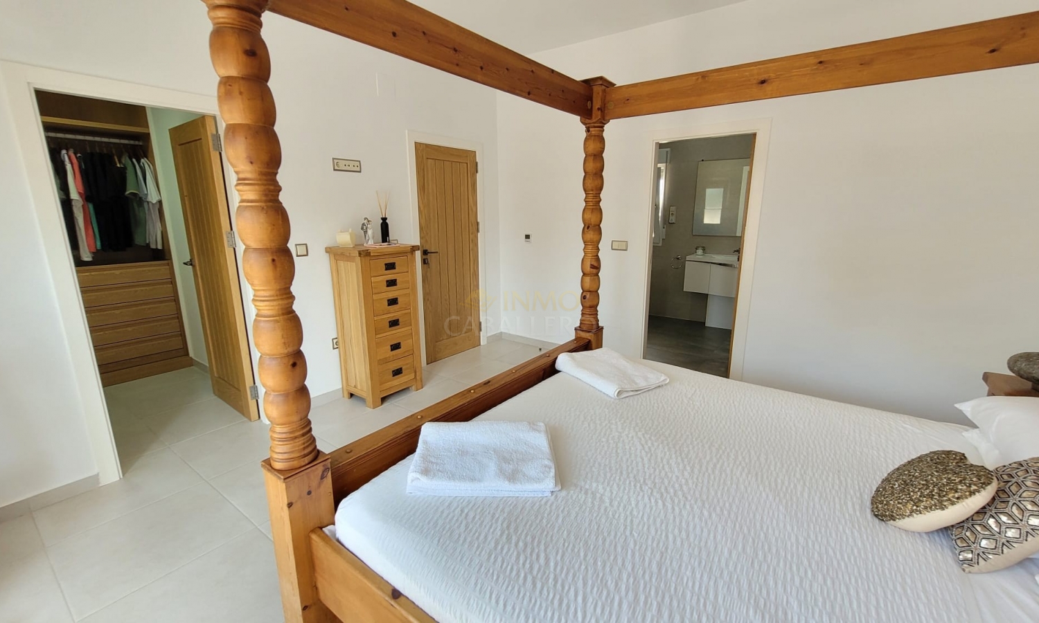 On accède à la maison principale par un charmant porche voûté qui mène à un spacieux séjour. À droite se trouvent la salle à manger avec accès au jardin et la cuisine entièrement équipée. Un couloir dessert deux chambres avec placards intégrés, chacune avec salle de bain attenante, des toilettes invités, un bureau (pouvant servir de chambre) avec accès à une terrasse et salle de bain attenante, la chambre principale avec accès à une terrasse, salle de bain attenante et dressing, ainsi qu'une buanderie donnant sur une terrasse.