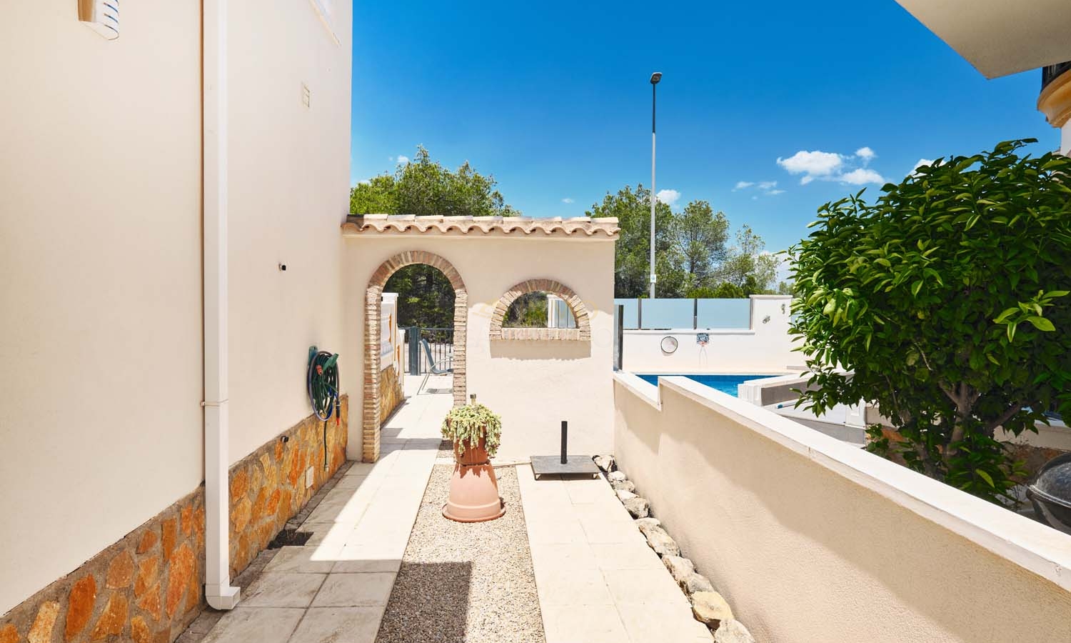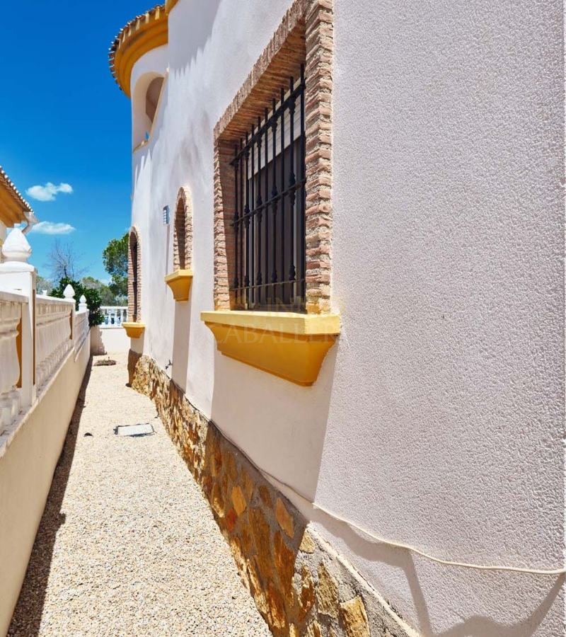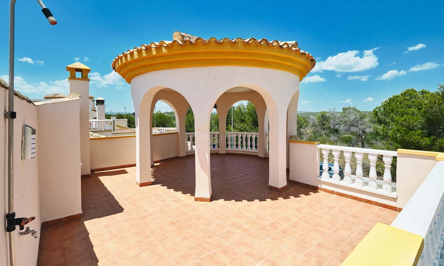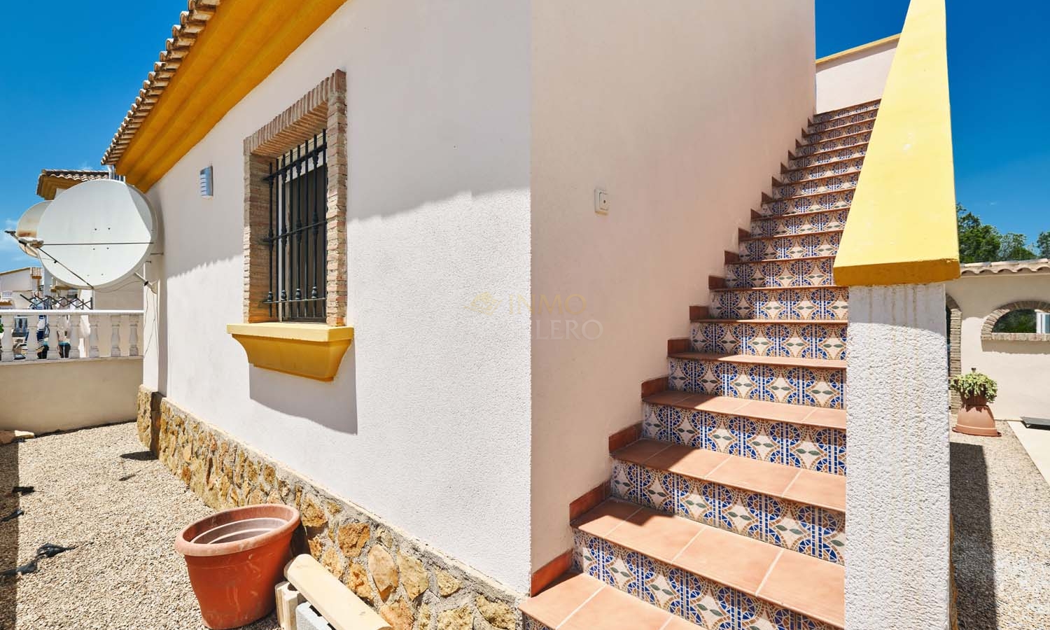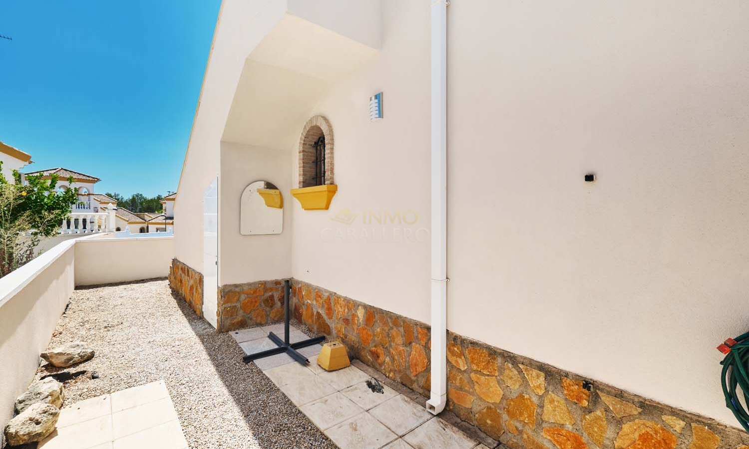 Sur le côté de la villa se trouve un débarras et, à l'arrière, un escalier extérieur mène à un grand solarium, dont la moitié est ombragée, idéale pendant les mois les plus chauds. Ce solarium privé dispose d'un second débarras et d'une douche, un espace idéal pour profiter de la vue imprenable.