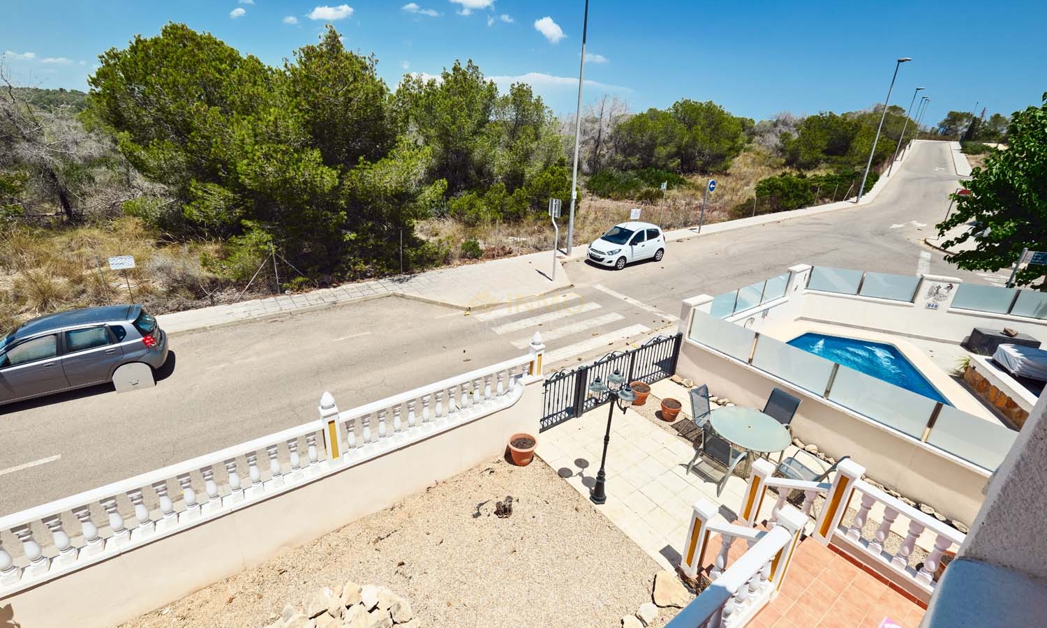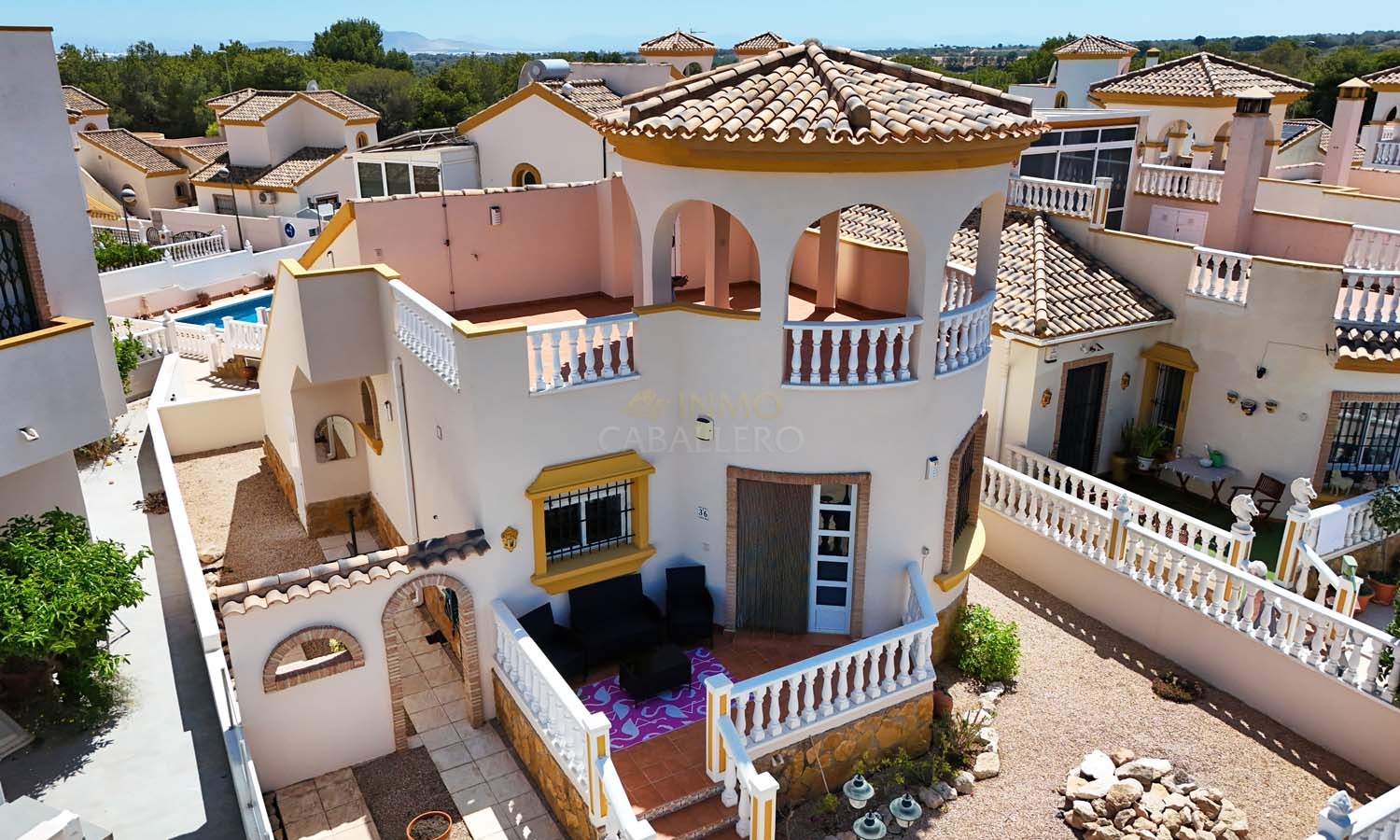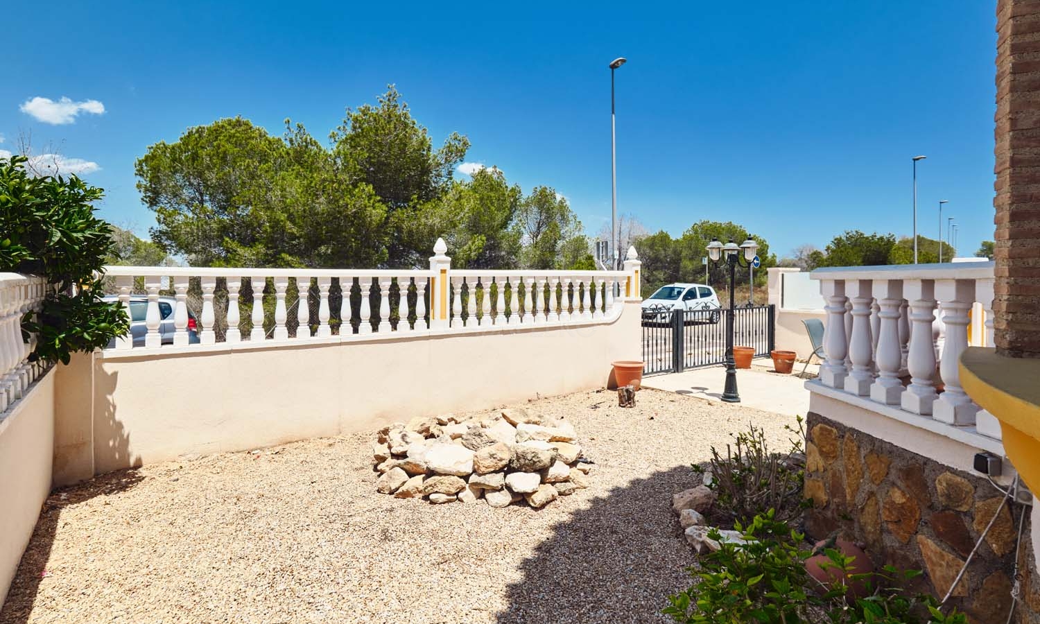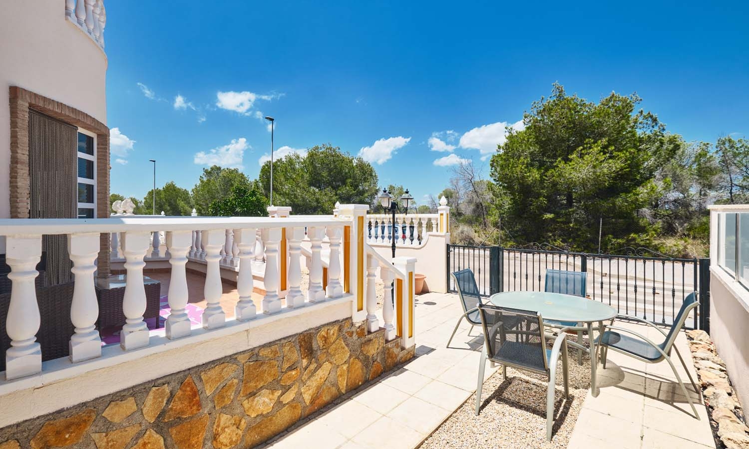 Sur le côté de la villa se trouve un débarras et, à l'arrière, un escalier extérieur mène à un grand solarium, dont la moitié est ombragée, idéale pendant les mois les plus chauds. Ce solarium privé dispose d'un second débarras et d'une douche, un espace idéal pour profiter de la vue imprenable.