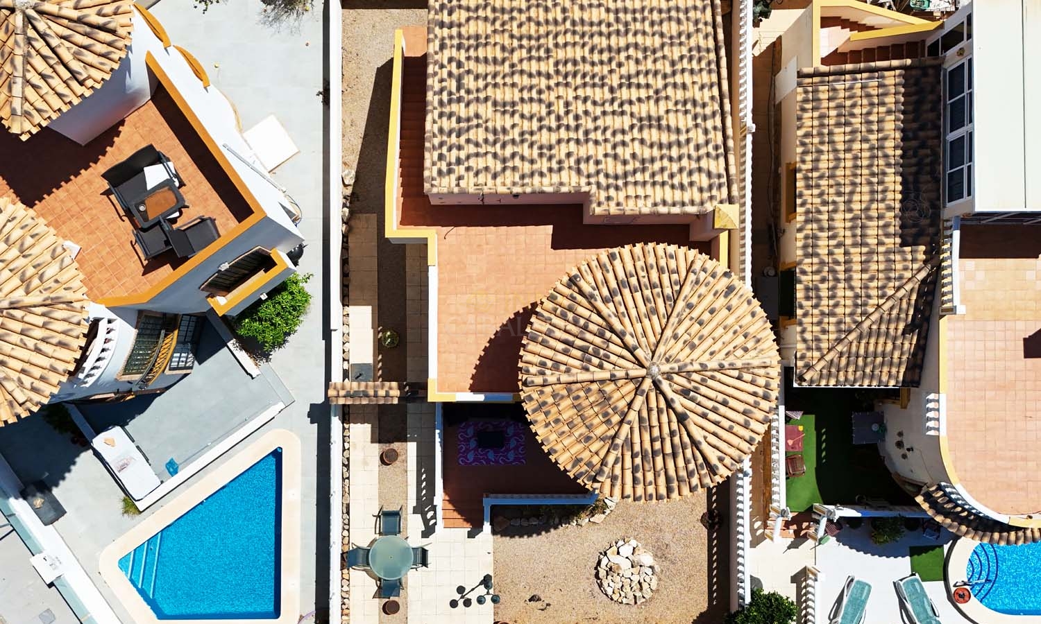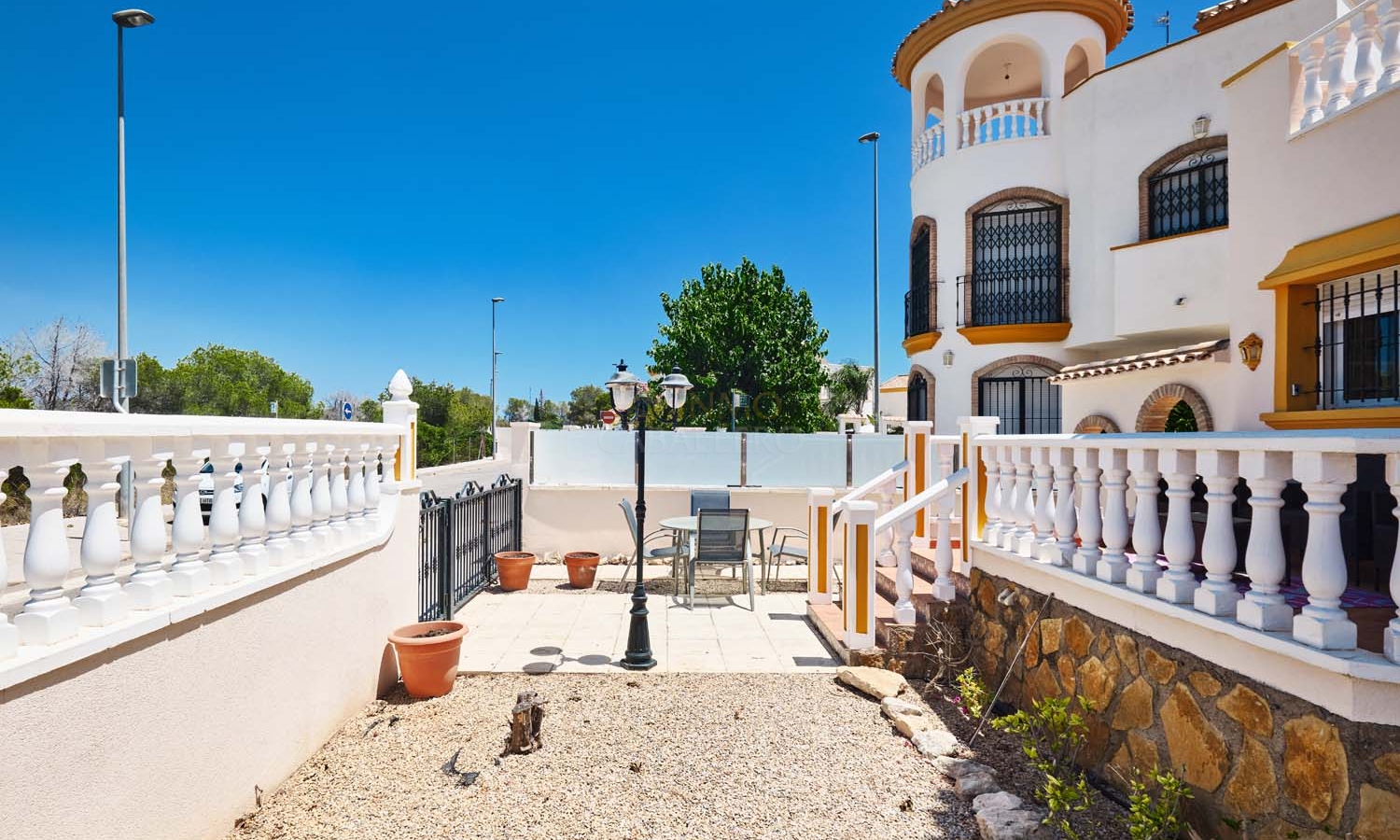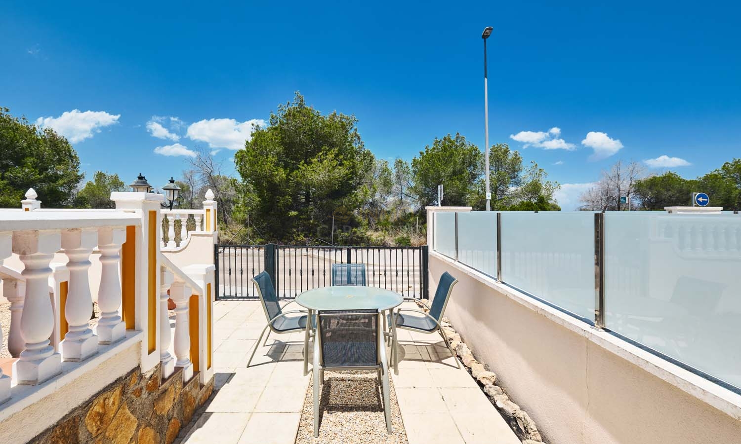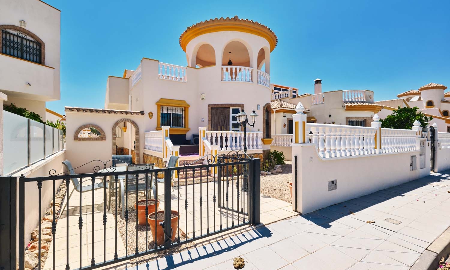 Sur le côté de la villa se trouve un débarras et, à l'arrière, un escalier extérieur mène à un grand solarium, dont la moitié est ombragée, idéale pendant les mois les plus chauds. Ce solarium privé dispose d'un second débarras et d'une douche, un espace idéal pour profiter de la vue imprenable.