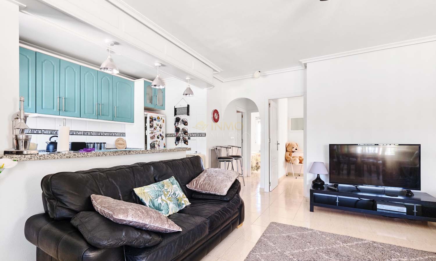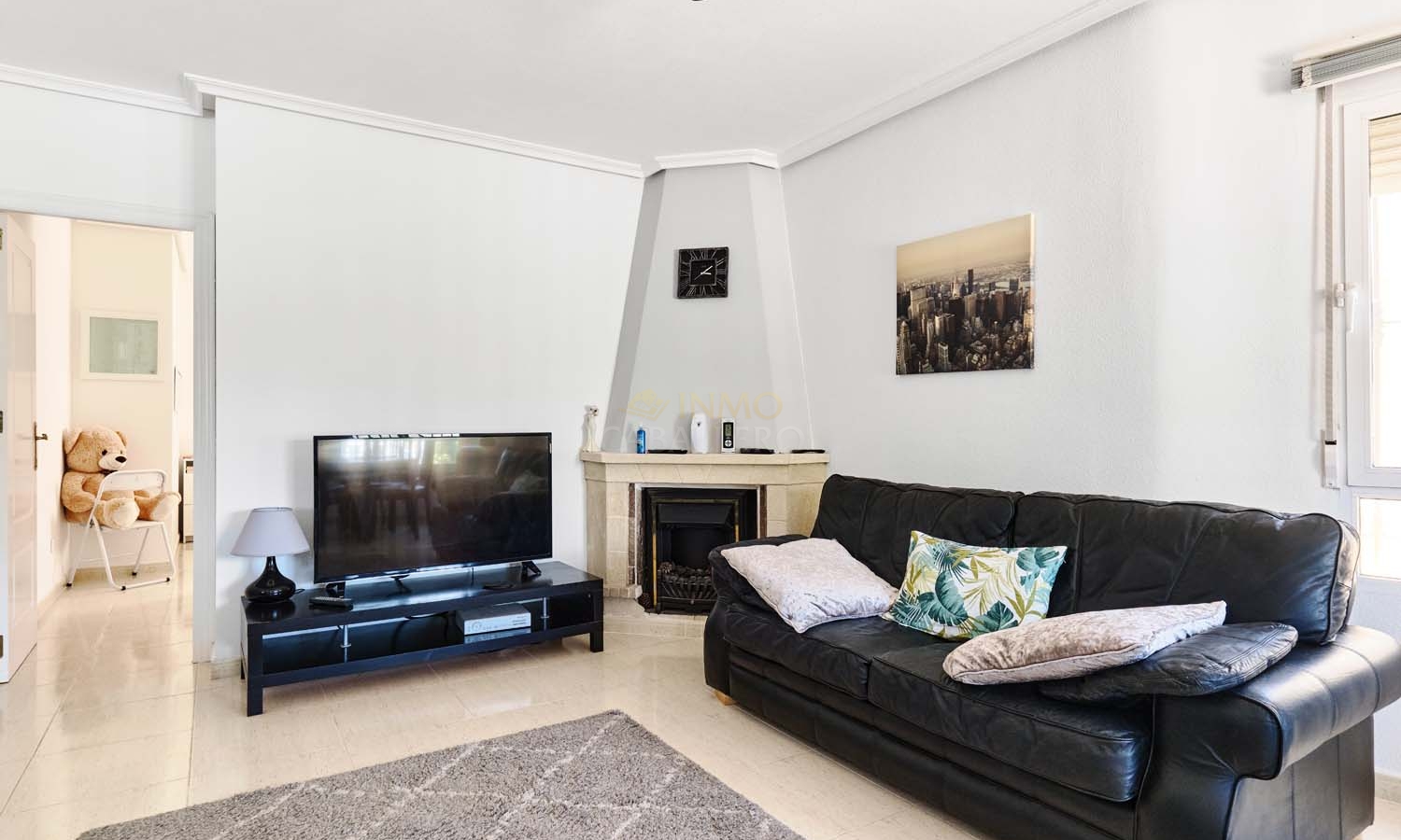 En entrant sur le terrain par le portail piéton, quelques marches mènent à une grande terrasse à l'avant de la villa. Celle-ci offre un espace salon et est idéale pour se détendre et profiter de la vue dégagée sur l'espace vert en face. L'entrée de la villa donne sur cette terrasse et s'ouvre sur un spacieux et lumineux salon/salle à manger ouvert avec cheminée. Sur le côté du salon se trouve la cuisine ouverte avec de nombreux placards de rangement et un bar, idéal pour des repas conviviaux. À l'arrière du séjour, une porte mène à la spacieuse chambre principale avec salle de bains privative avec douche et placards intégrés. Près de la cuisine, un couloir dessert la deuxième chambre, une chambre double spacieuse avec placards intégrés, ainsi que la salle de bains familiale avec baignoire.