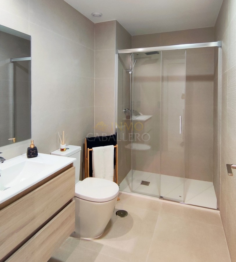 Baños completamente equipados con mueble de lavabo, inodoro, espejo iluminado, ducha y mampara.