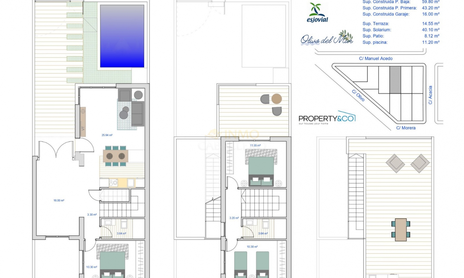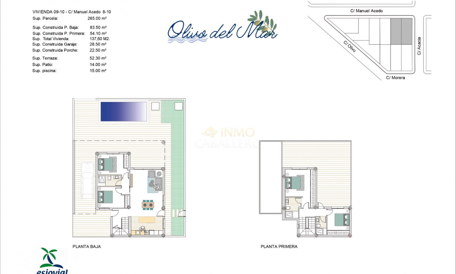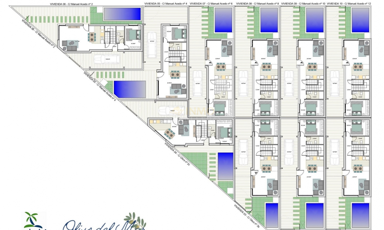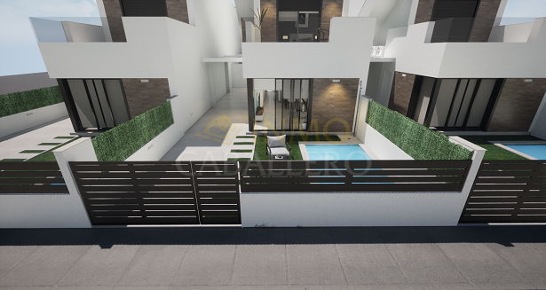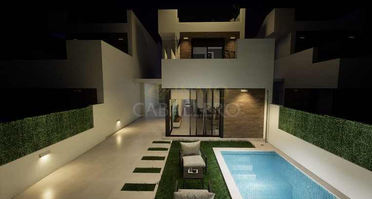 A 400M de la playa, Residencial Olivo Del Mar I es un complejo de 10 villas con piscina privada además de garaje cubierto para cada propiedad. Estas villas son de estilo dúplex con terrazas en planta baja, primera y segunda con diferentes orientaciones, lo que permite disfrutar de cada hora de sol todos los días del año. Cada propiedad tiene 3 dormitorios y 2 baños. Constan en planta baja: 1 salón-comedor con cocina abierta, 1 dormitorio doble y 1 baño. Arriba hay 2 dormitorios dobles, 1 baño, 1 terraza y acceso a la azotea de 40m2. El complejo está situado en Los Alcázares (Murcia), a 400 metros de las playas de arena y a 30 minutos en coche del aeropuerto de Murcia. Además está rodeado de todos los servicios, instalaciones deportivas y cerca de varios campos de golf como Roda Golf, La Serena Golf, Mar Menor Golf y muchos otros. Las propiedades cumplirán con los más altos estándares y estarán equipadas con: Piscina privada con ducha exterior. Cocina de verano en solarium. Cocina equipada con todos los electrodomésticos: frigorífico, vitrocerámica, horno elevado, microondas empotrado, campana extractora y lavavajillas integrado. Armarios forrados con cajones. Baños con WC, mueble bajo lavabo, espejo con luz y mamparas de ducha. Preinstalación de aire acondicionado. Zona de garaje cubierta.