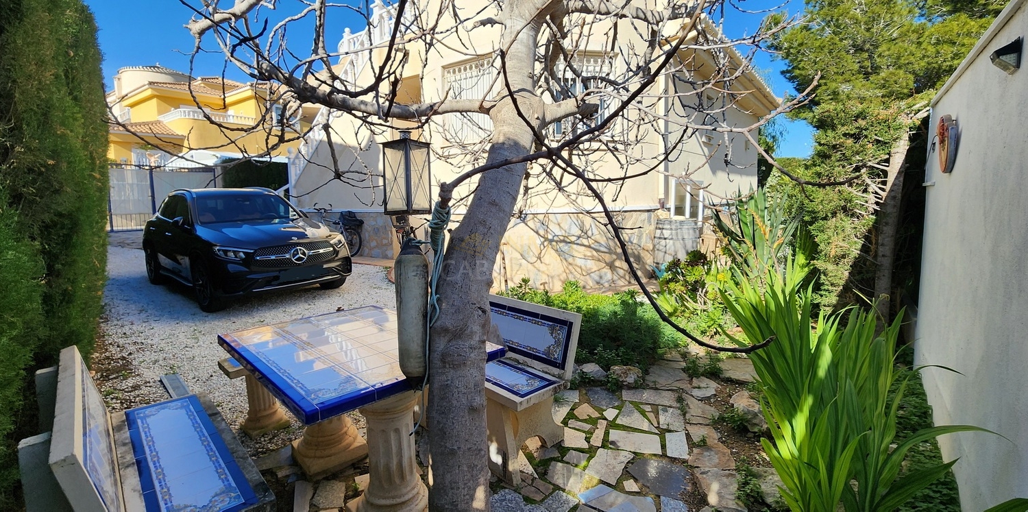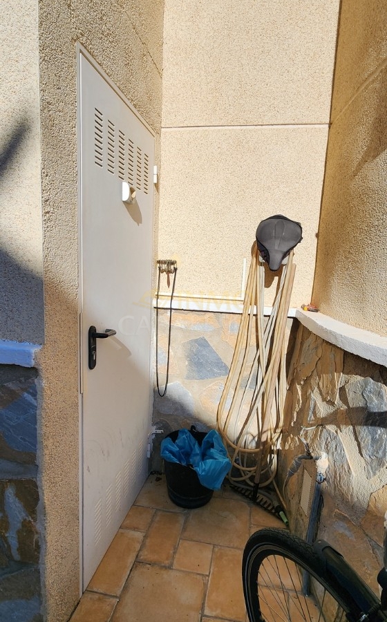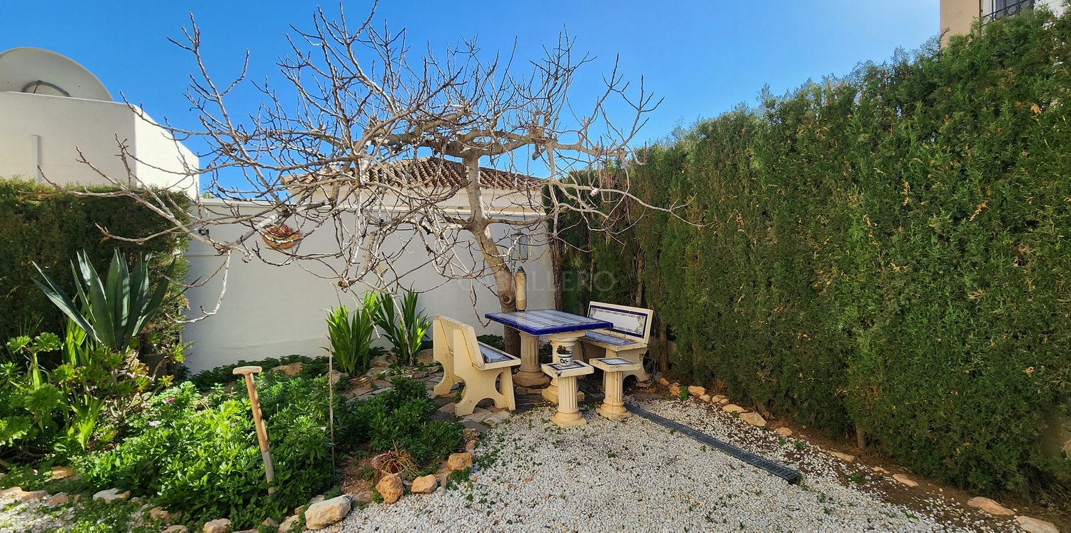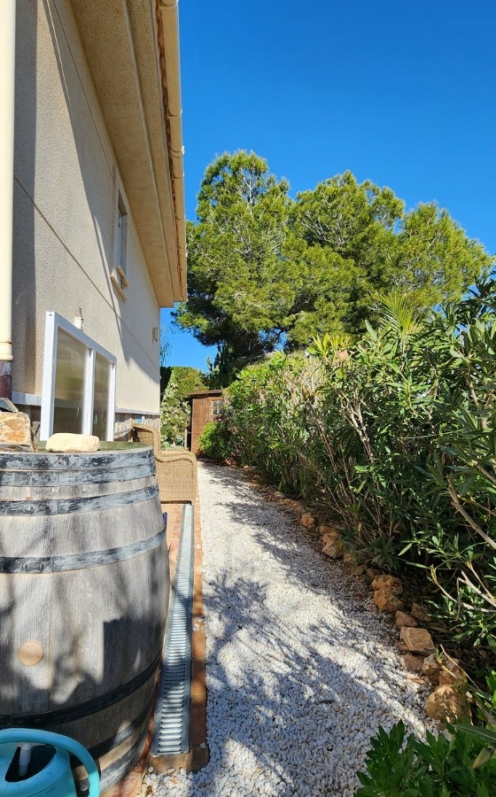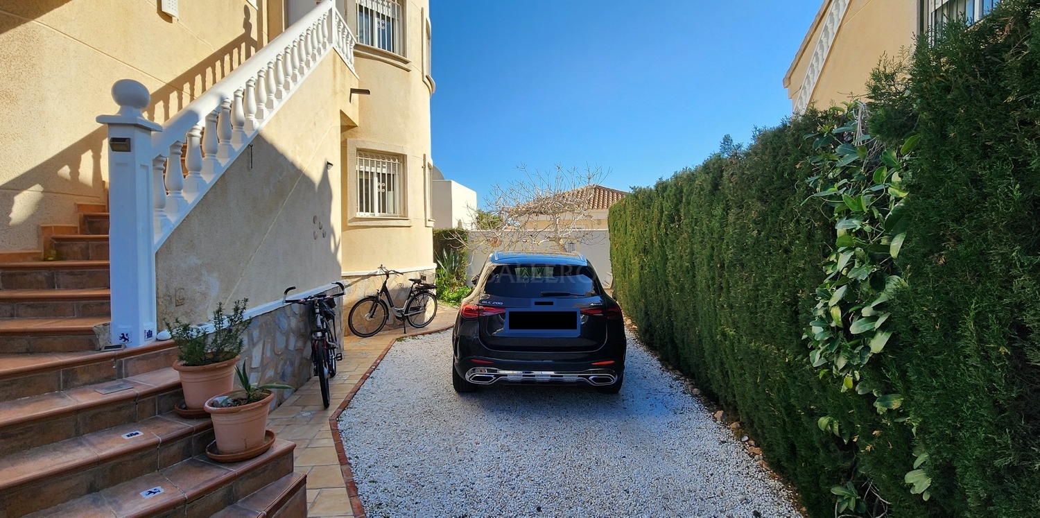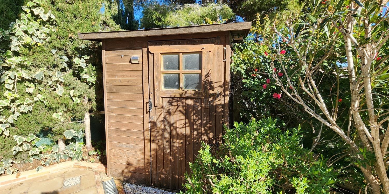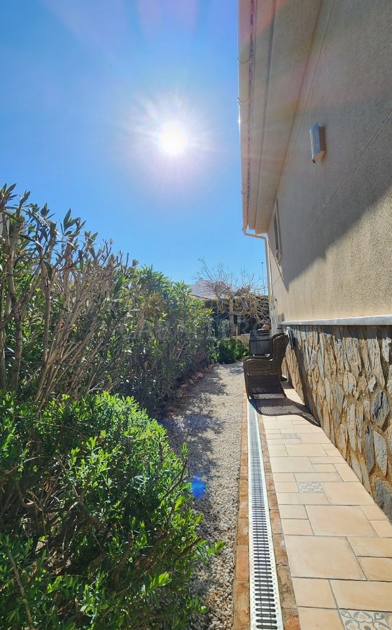 El exterior cuenta con un jardín de bajo mantenimiento, piscina privada de agua salina, aparcamiento para dos vehículos, caseta de madera y trastero.