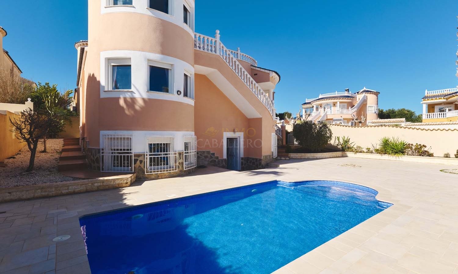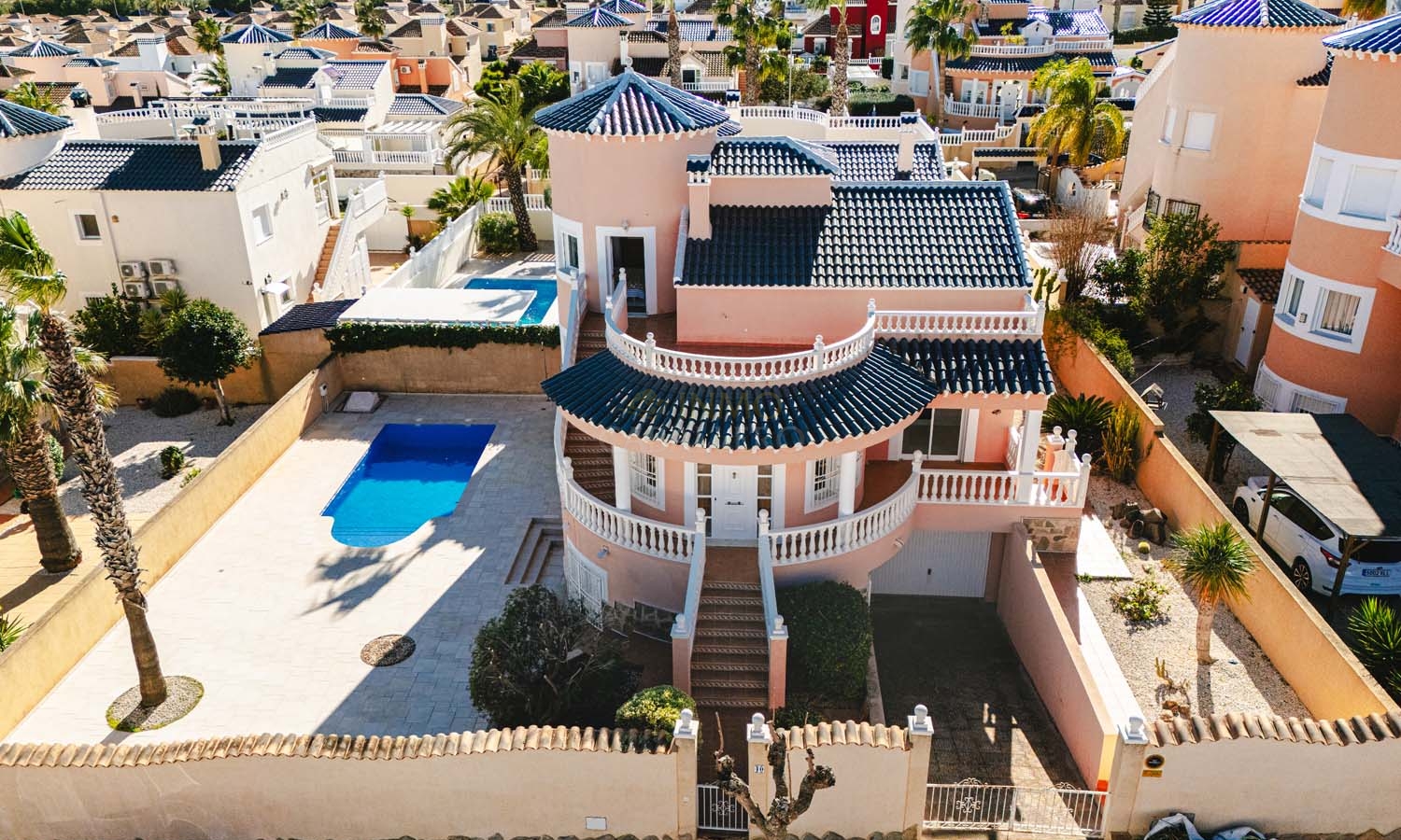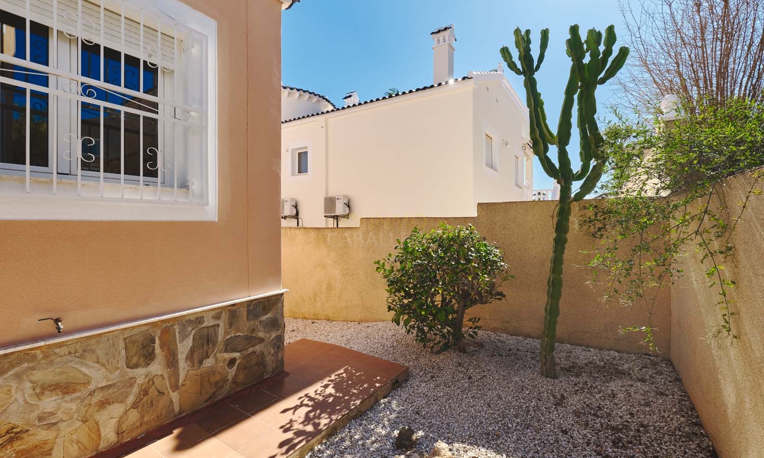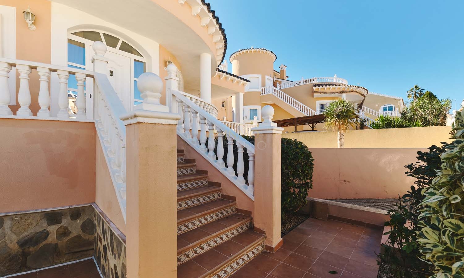 En el exterior, la villa cuenta con una zona exterior privada, ideal para relajarse y disfrutar. El terreno, de fácil mantenimiento, está realzado por árboles y plantas maduras. La zona alrededor de la piscina privada está embaldosada para mayor comodidad y ofrece amplio espacio para una cocina/bar al aire libre y zonas de relax. Se puede aparcar un coche delante de la puerta del garaje y hay amplio aparcamiento en la calle.