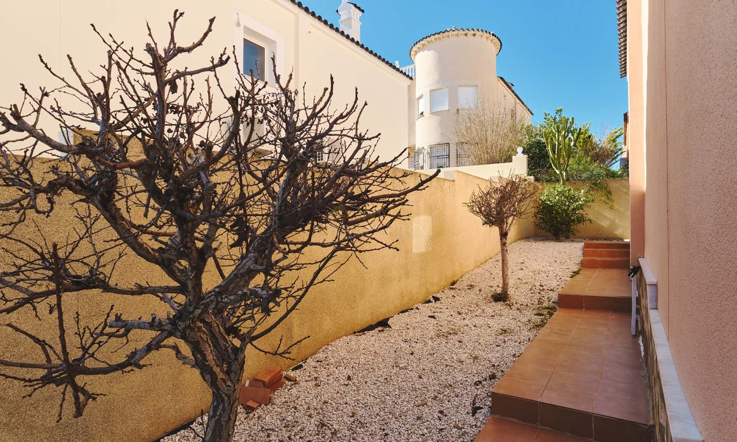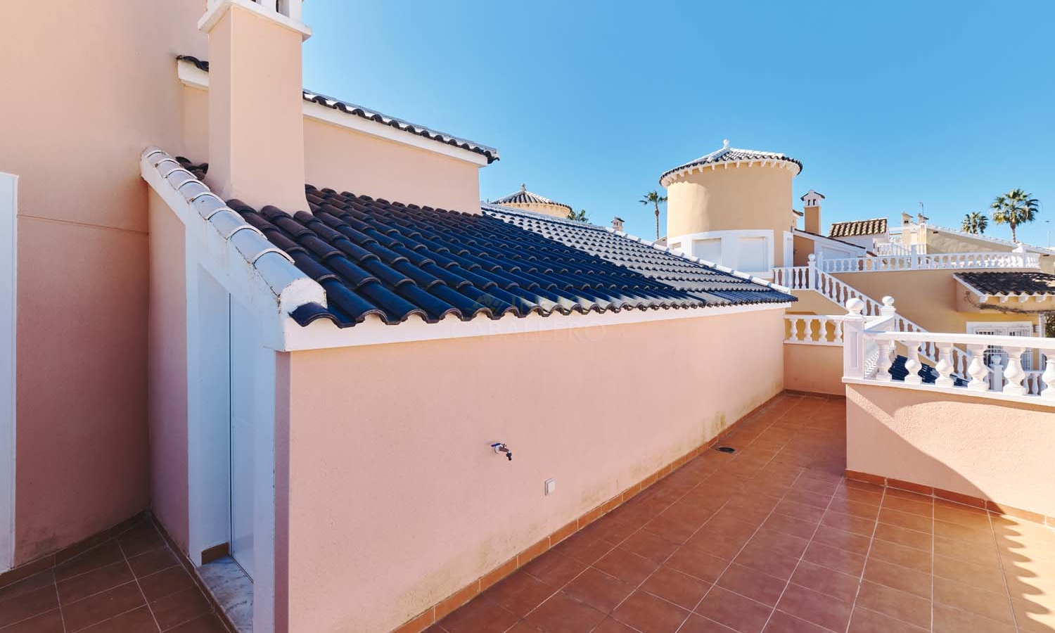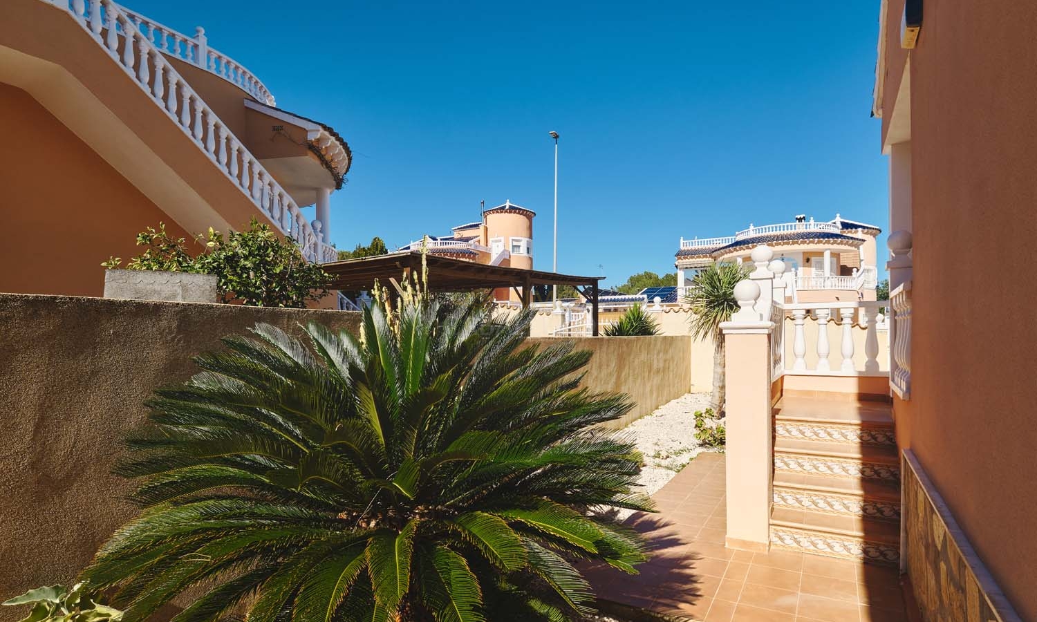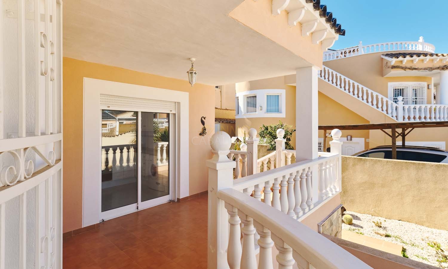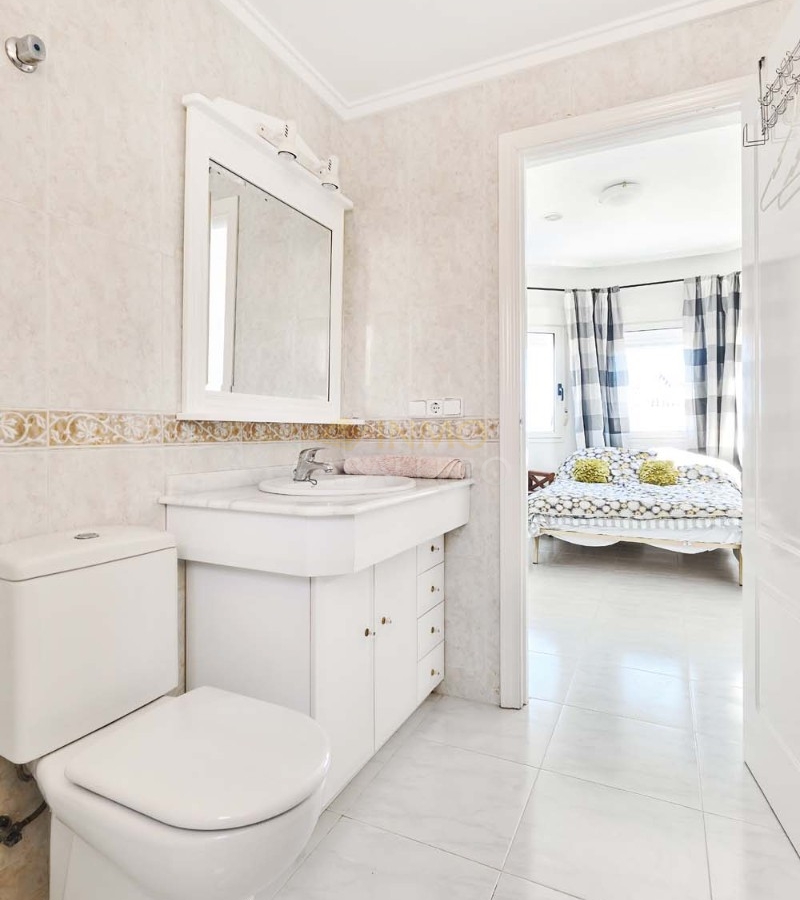 Un punto destacado de esta propiedad es su dormitorio de invitados con baño en suite, ubicado en la primera planta, al que se accede por una escalera exterior lateral. Este dormitorio tiene acceso a un amplio solárium privado con impresionantes vistas al mar. En la misma planta se encuentra un práctico trastero, que muchas propiedades vecinas han reconvertido con éxito en un dormitorio adicional, lo que ofrece la posibilidad de ampliar la superficie habitable y aumentar el valor de la propiedad.