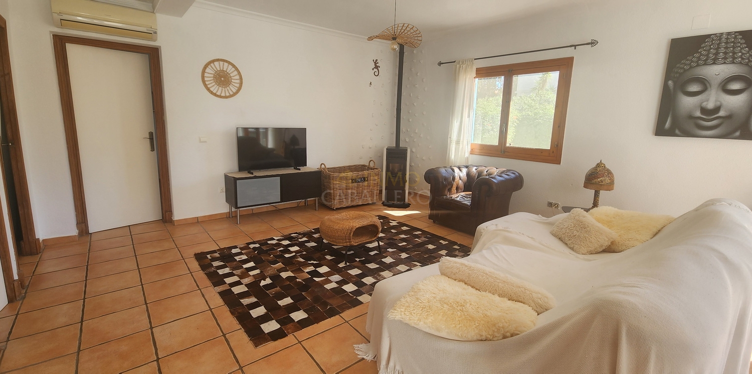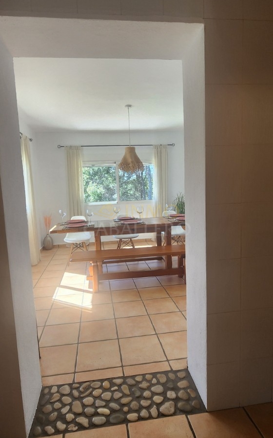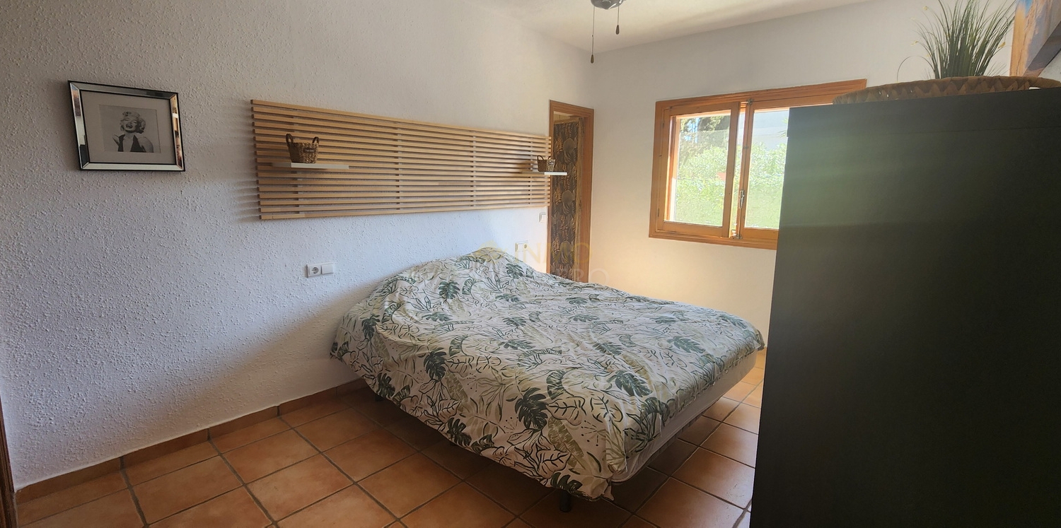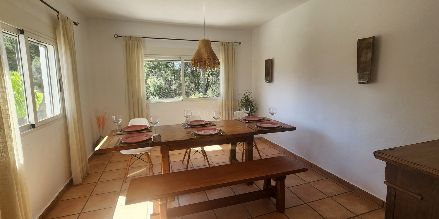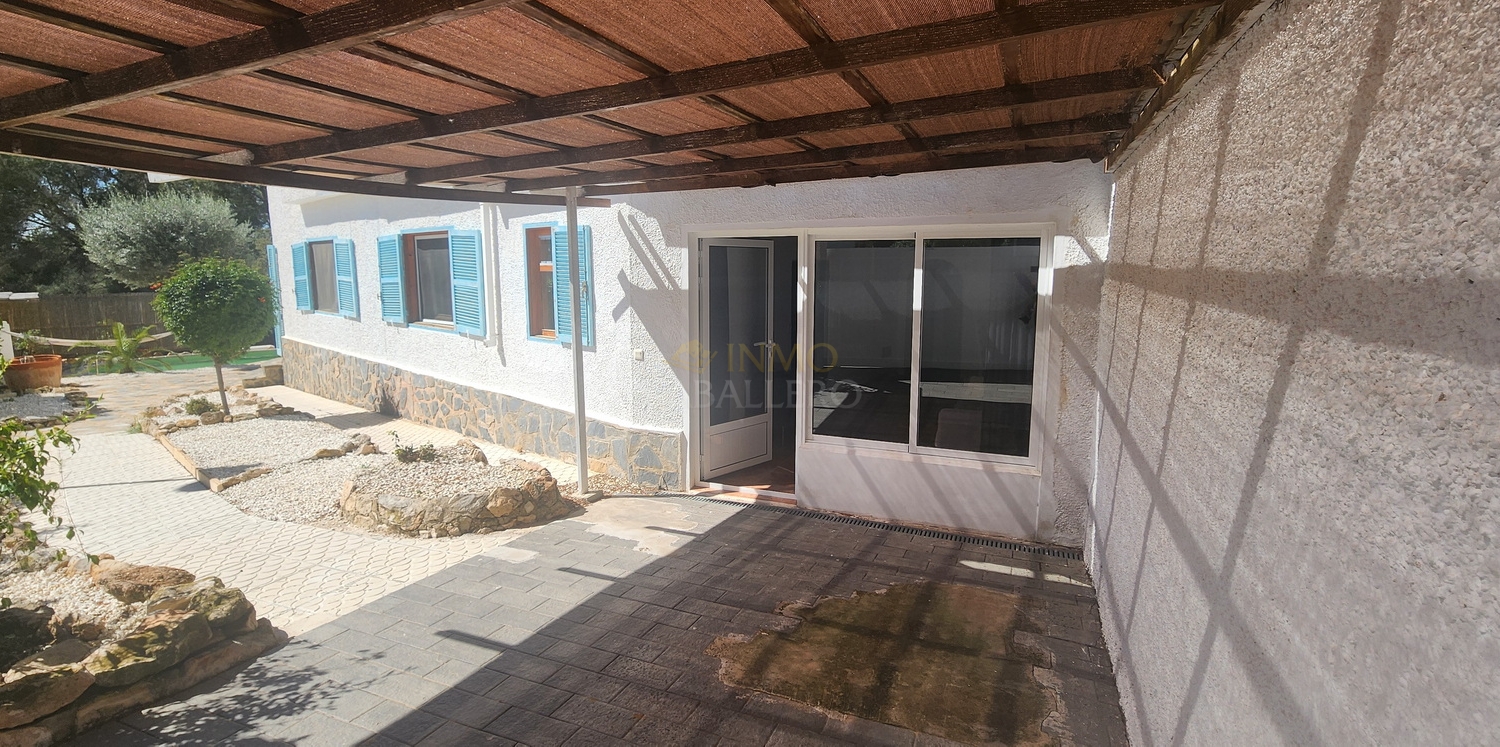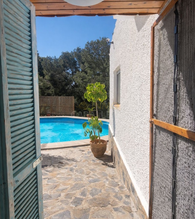 Chalet de estilo ibicenco con piscina privada, situado en una amplia parcela de 1.626 m² rodeada de naturaleza. La vivienda, distribuida en una sola planta, ofrece un ambiente cómodo y acogedor.