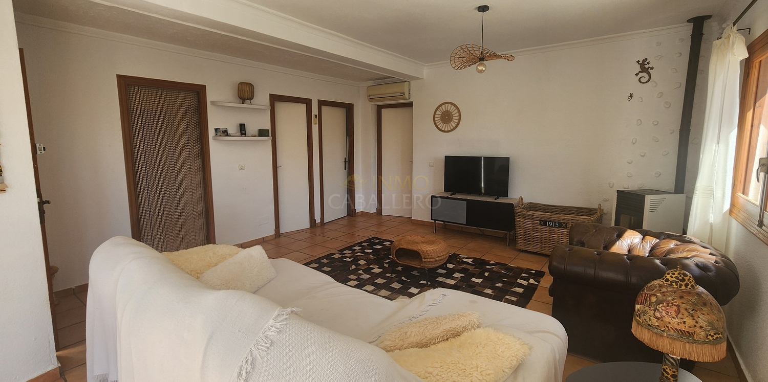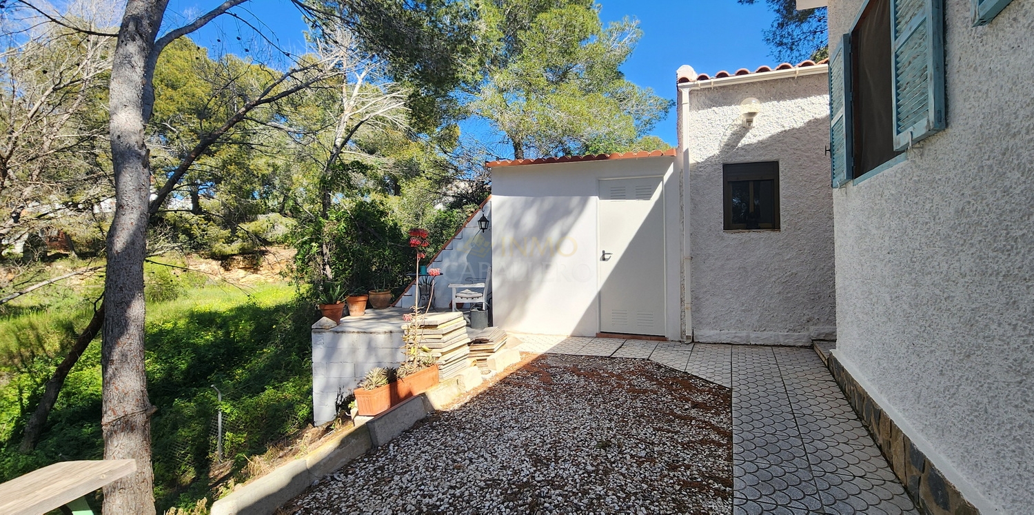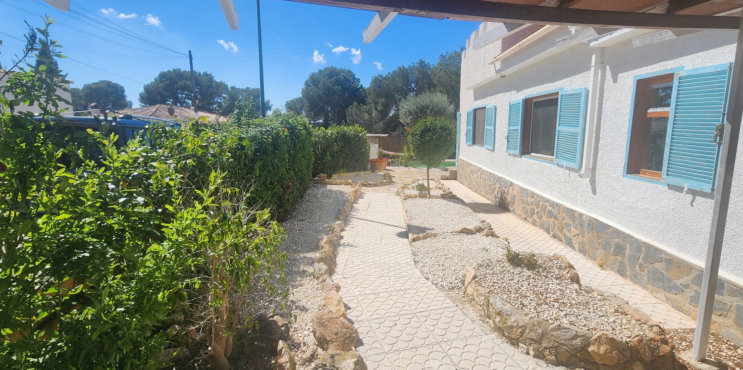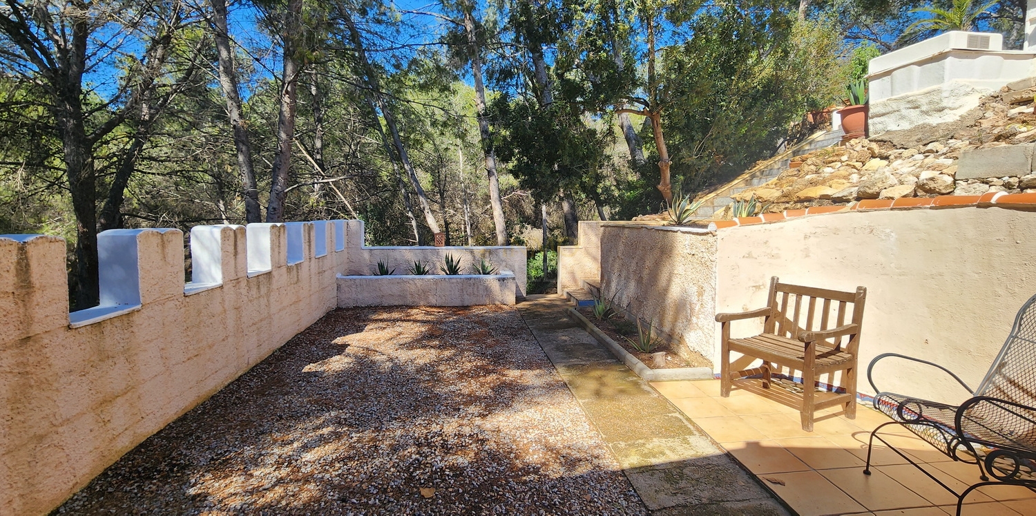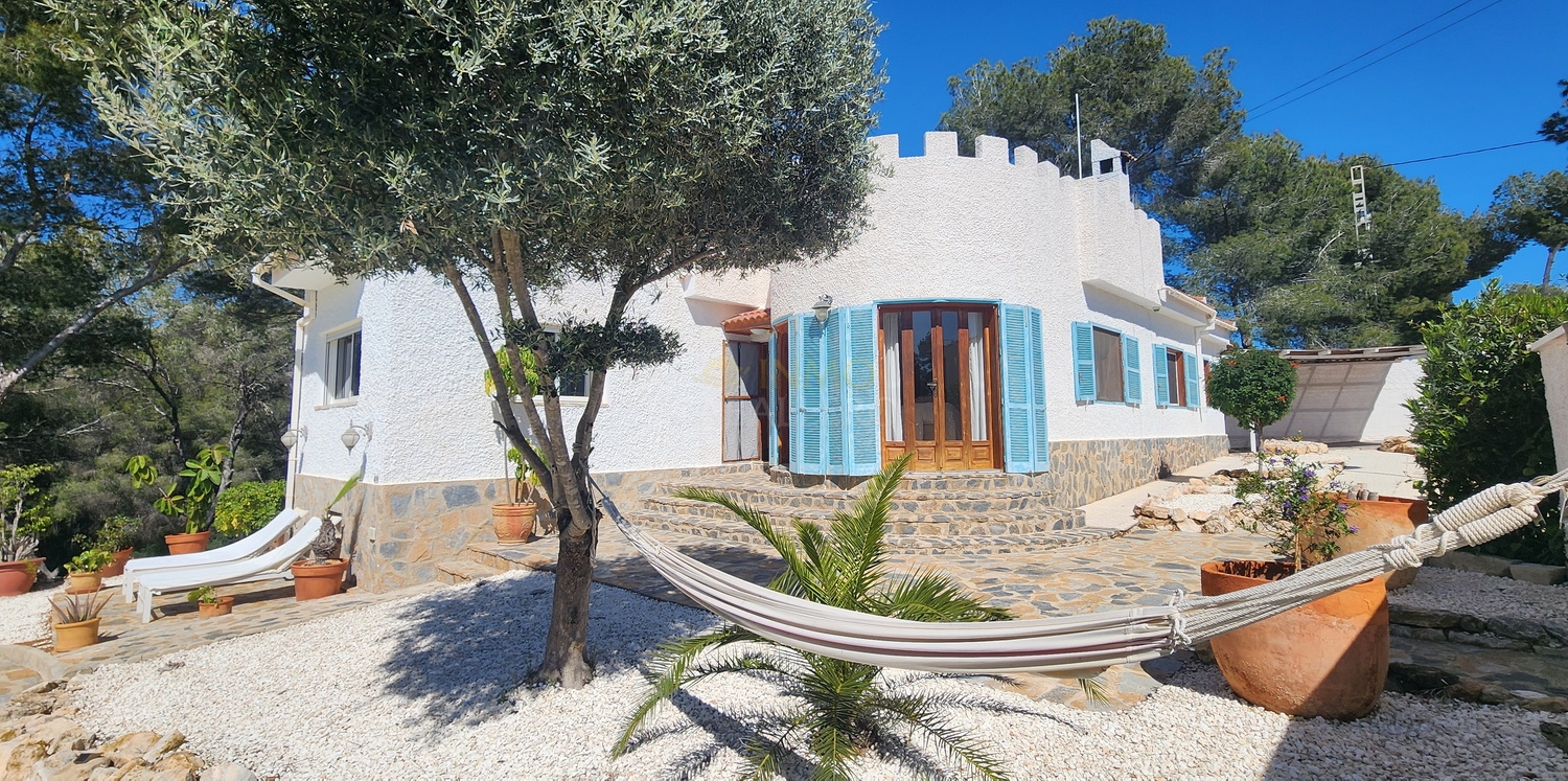 Chalet de estilo ibicenco con piscina privada, situado en una amplia parcela de 1.626 m² rodeada de naturaleza. La vivienda, distribuida en una sola planta, ofrece un ambiente cómodo y acogedor.