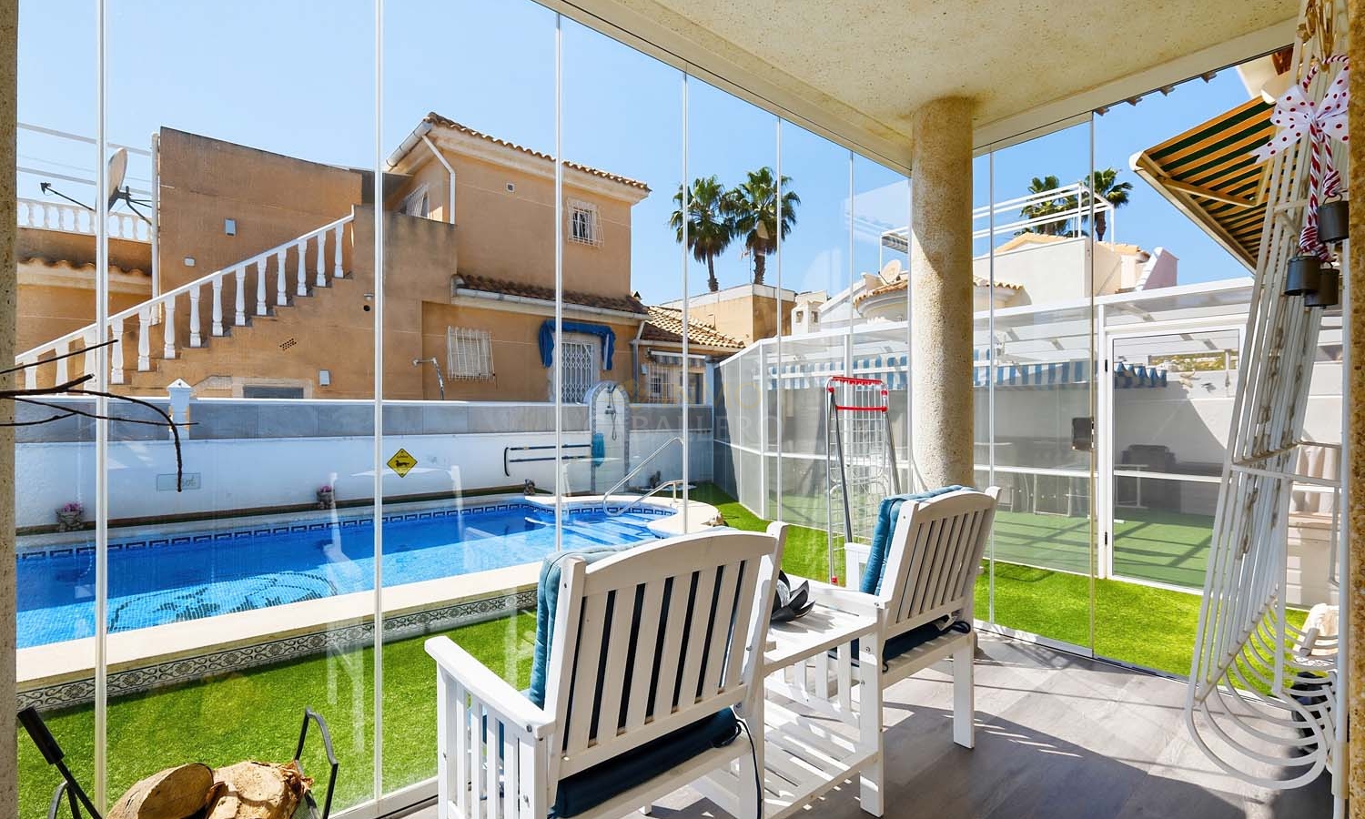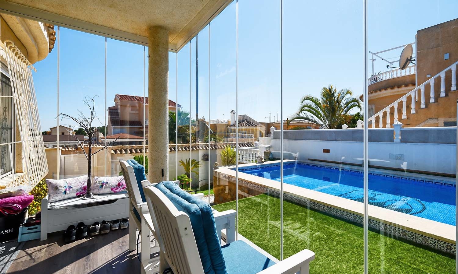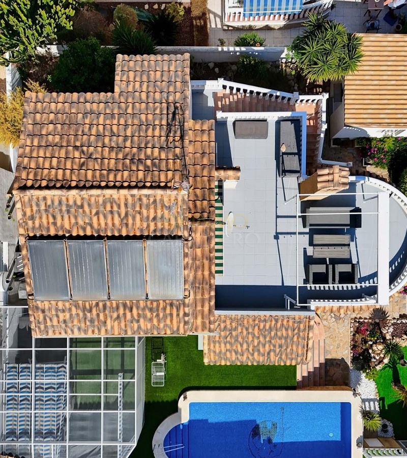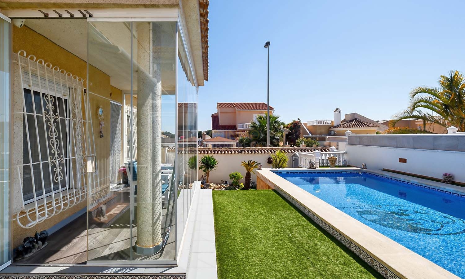 La planta baja cuenta con un amplio y luminoso salón-comedor diáfano, creando un espacio acogedor para el día a día y para recibir invitados. La cocina, situada en la parte trasera del salón, ha sido reformada con muebles modernos y tiene acceso directo al jardín. Un pasillo desde el salón conduce al resto de la planta baja: un lavadero independiente (originalmente un segundo baño, que se puede reconvertir fácilmente si se desea), un dormitorio doble, un baño completamente reformado con ducha a ras de suelo y el amplio dormitorio principal con acceso directo a la piscina. Frente a la villa se encuentra una encantadora terraza acristalada con cortinas de cristal que da a la piscina, un espacio ideal para relajarse durante todo el año.