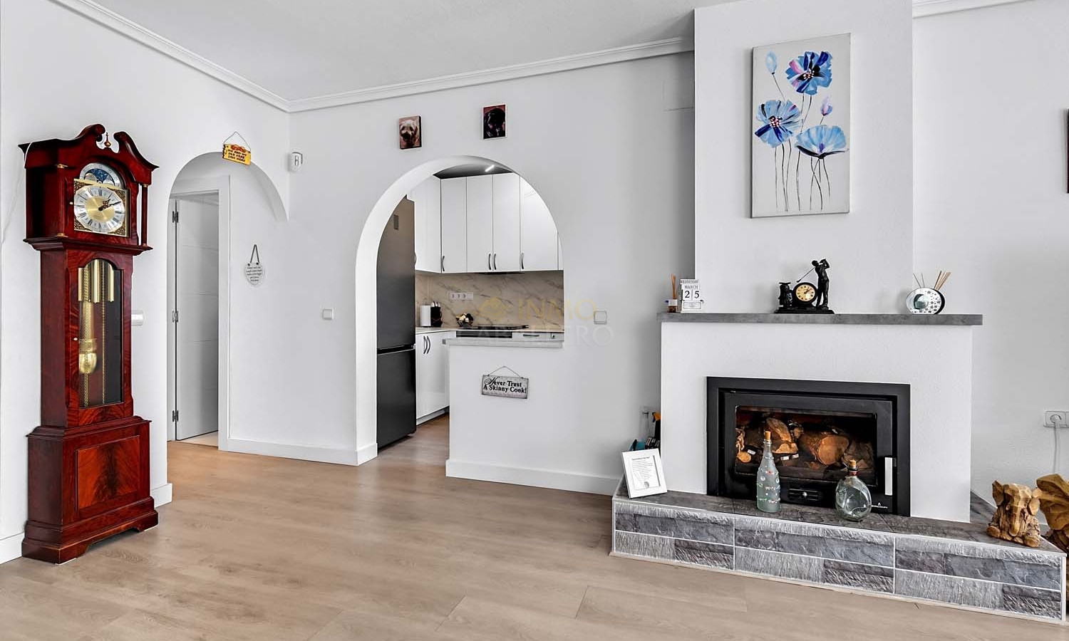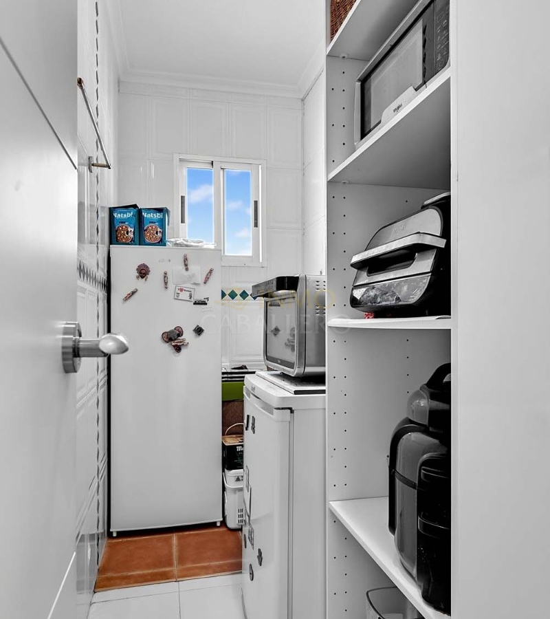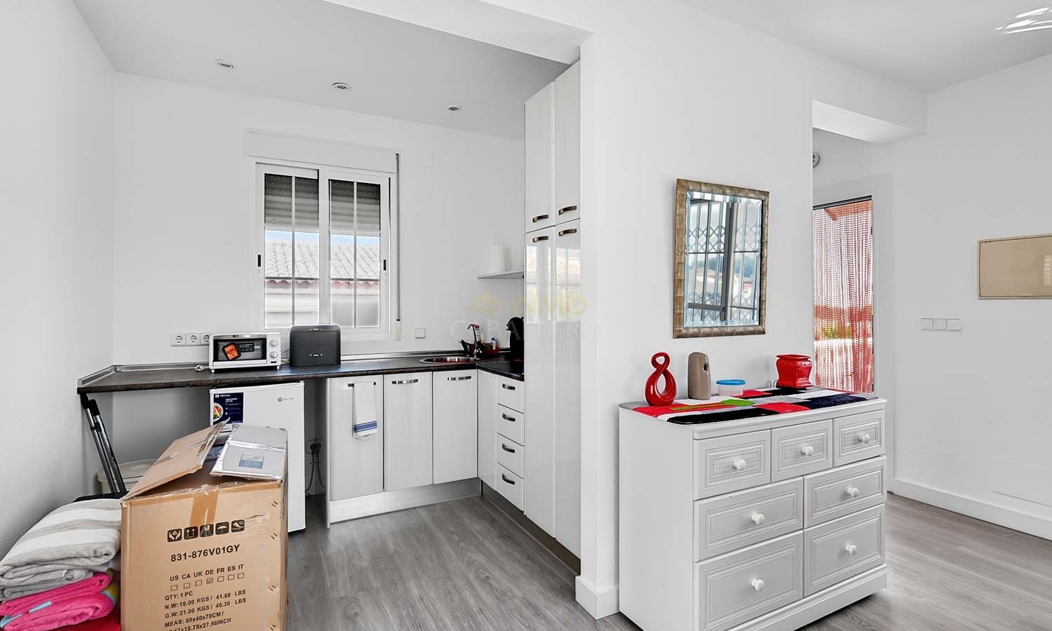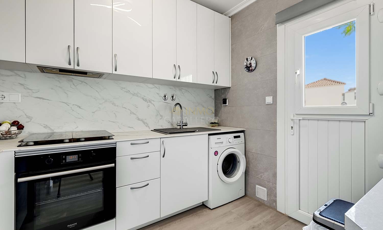 La planta baja cuenta con un amplio y luminoso salón-comedor diáfano, creando un espacio acogedor para el día a día y para recibir invitados. La cocina, situada en la parte trasera del salón, ha sido reformada con muebles modernos y tiene acceso directo al jardín. Un pasillo desde el salón conduce al resto de la planta baja: un lavadero independiente (originalmente un segundo baño, que se puede reconvertir fácilmente si se desea), un dormitorio doble, un baño completamente reformado con ducha a ras de suelo y el amplio dormitorio principal con acceso directo a la piscina. Frente a la villa se encuentra una encantadora terraza acristalada con cortinas de cristal que da a la piscina, un espacio ideal para relajarse durante todo el año.