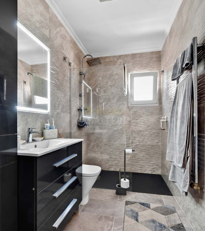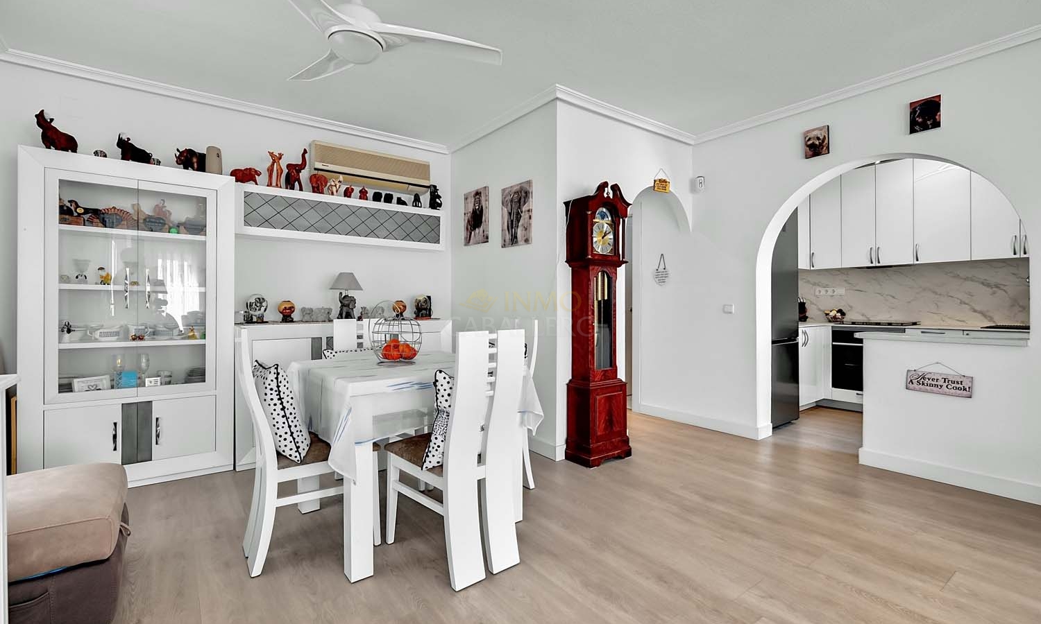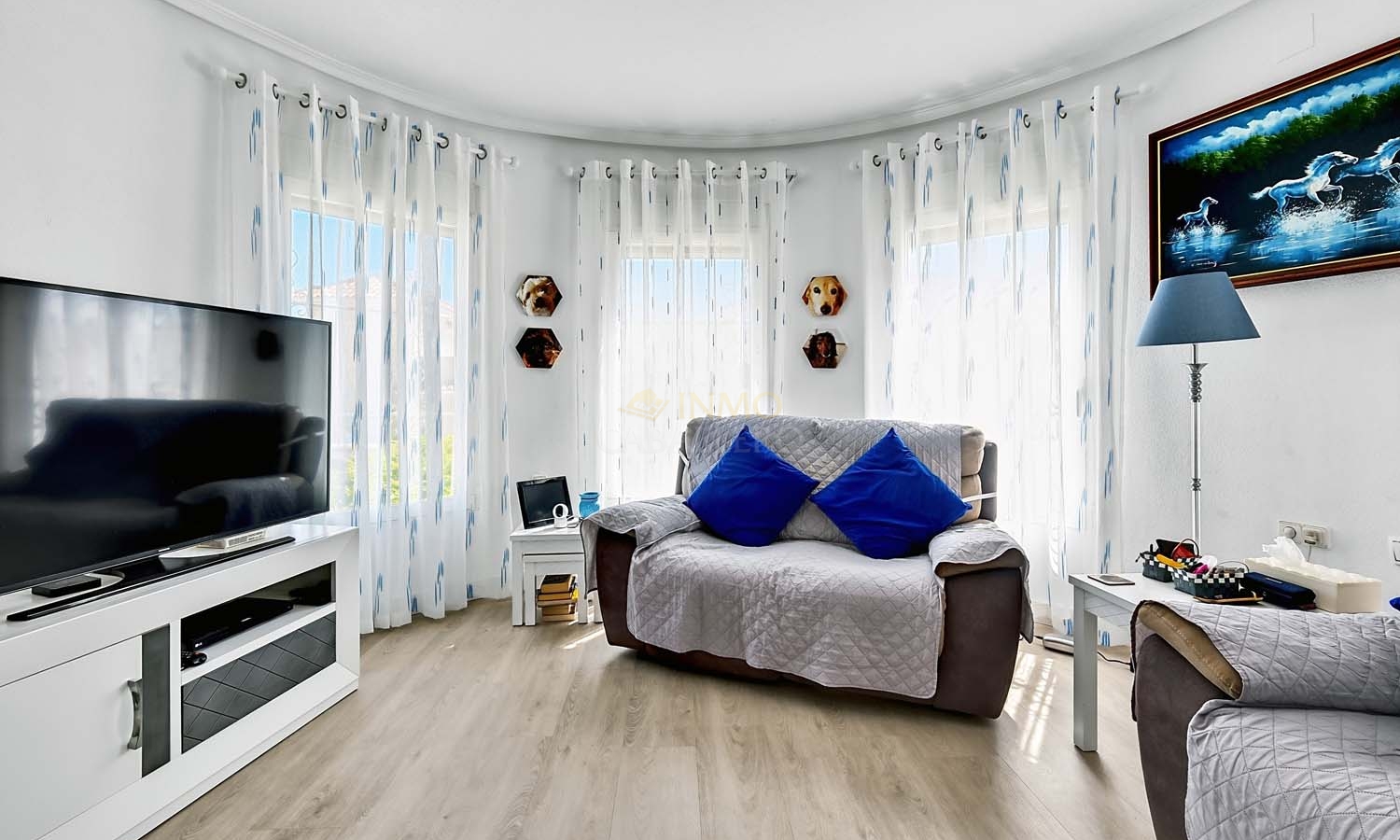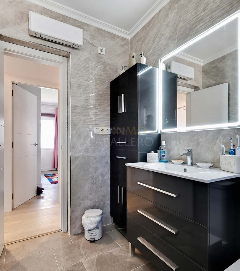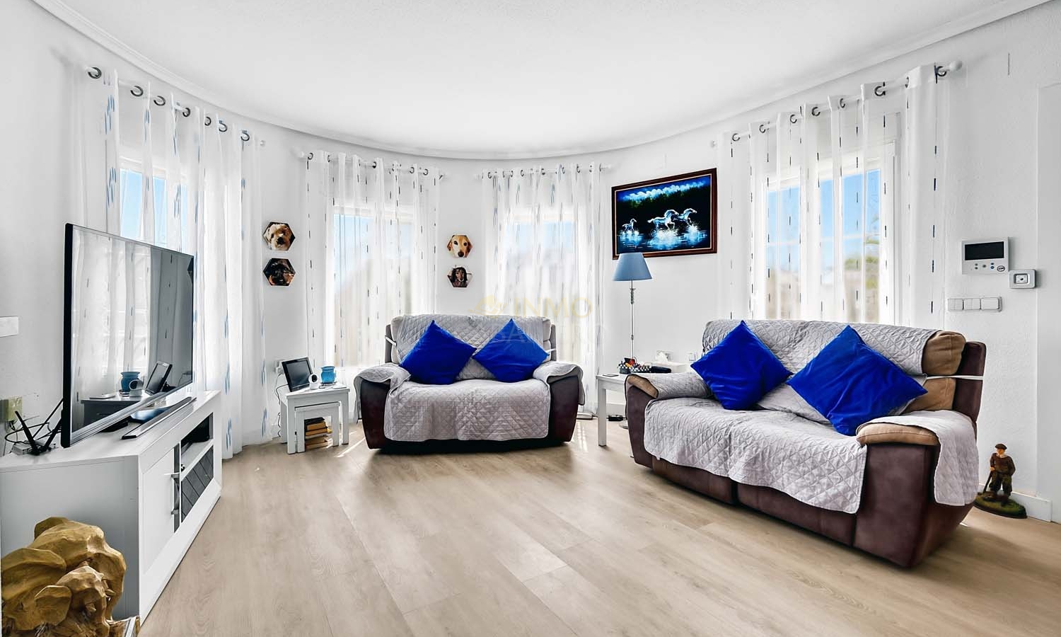 La planta baja cuenta con un amplio y luminoso salón-comedor diáfano, creando un espacio acogedor para el día a día y para recibir invitados. La cocina, situada en la parte trasera del salón, ha sido reformada con muebles modernos y tiene acceso directo al jardín. Un pasillo desde el salón conduce al resto de la planta baja: un lavadero independiente (originalmente un segundo baño, que se puede reconvertir fácilmente si se desea), un dormitorio doble, un baño completamente reformado con ducha a ras de suelo y el amplio dormitorio principal con acceso directo a la piscina. Frente a la villa se encuentra una encantadora terraza acristalada con cortinas de cristal que da a la piscina, un espacio ideal para relajarse durante todo el año.