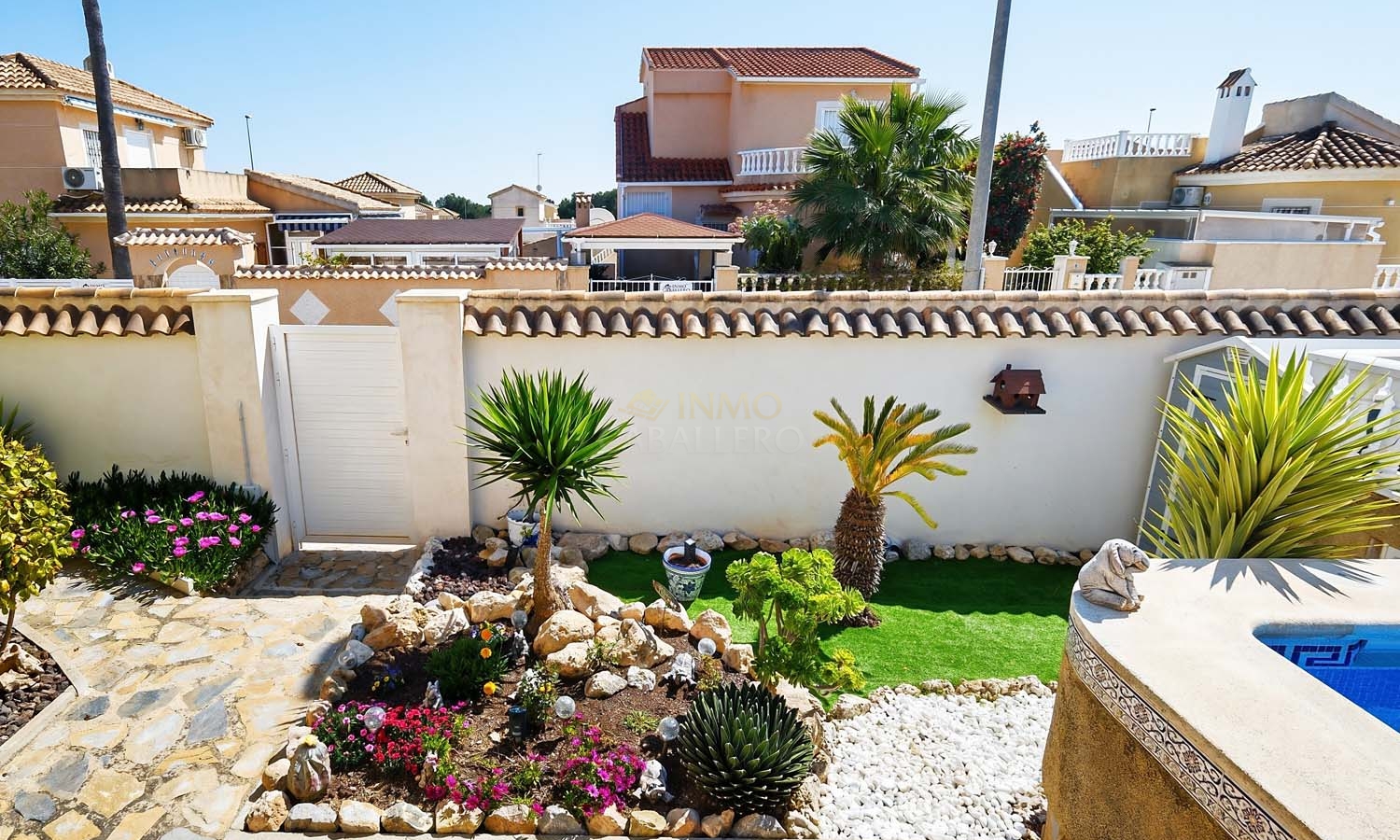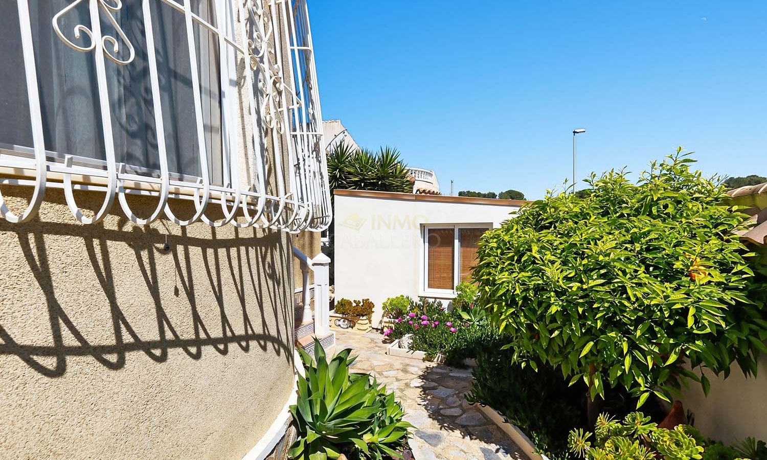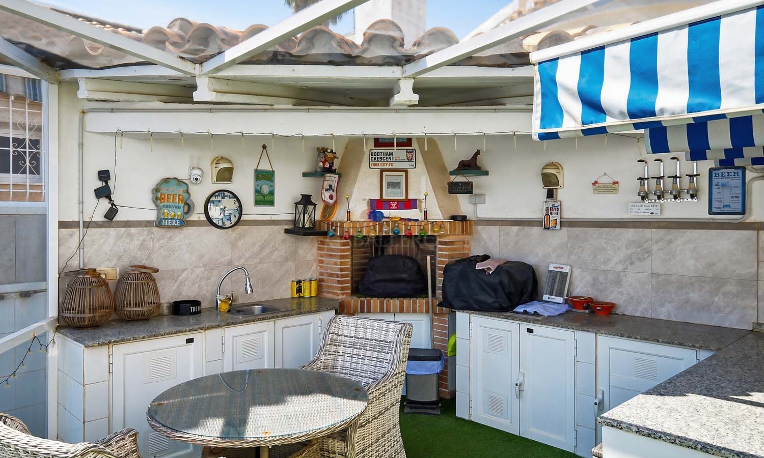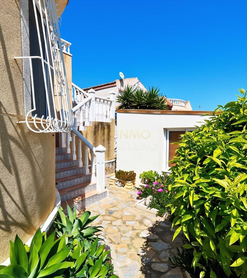 La villa se encuentra en una bonita parcela bien cuidada, con abundante vegetación. Dispone de una gran piscina con amplio espacio para tomar el sol. También cuenta con una fantástica cocina exterior con bar, barbacoa de obra y zona de estar, protegida con mosquiteras, perfecta para recibir invitados y disfrutar de las cálidas noches. La villa también incluye un amplio cobertizo en la parte delantera de la parcela y un trastero más pequeño bajo la escalera.