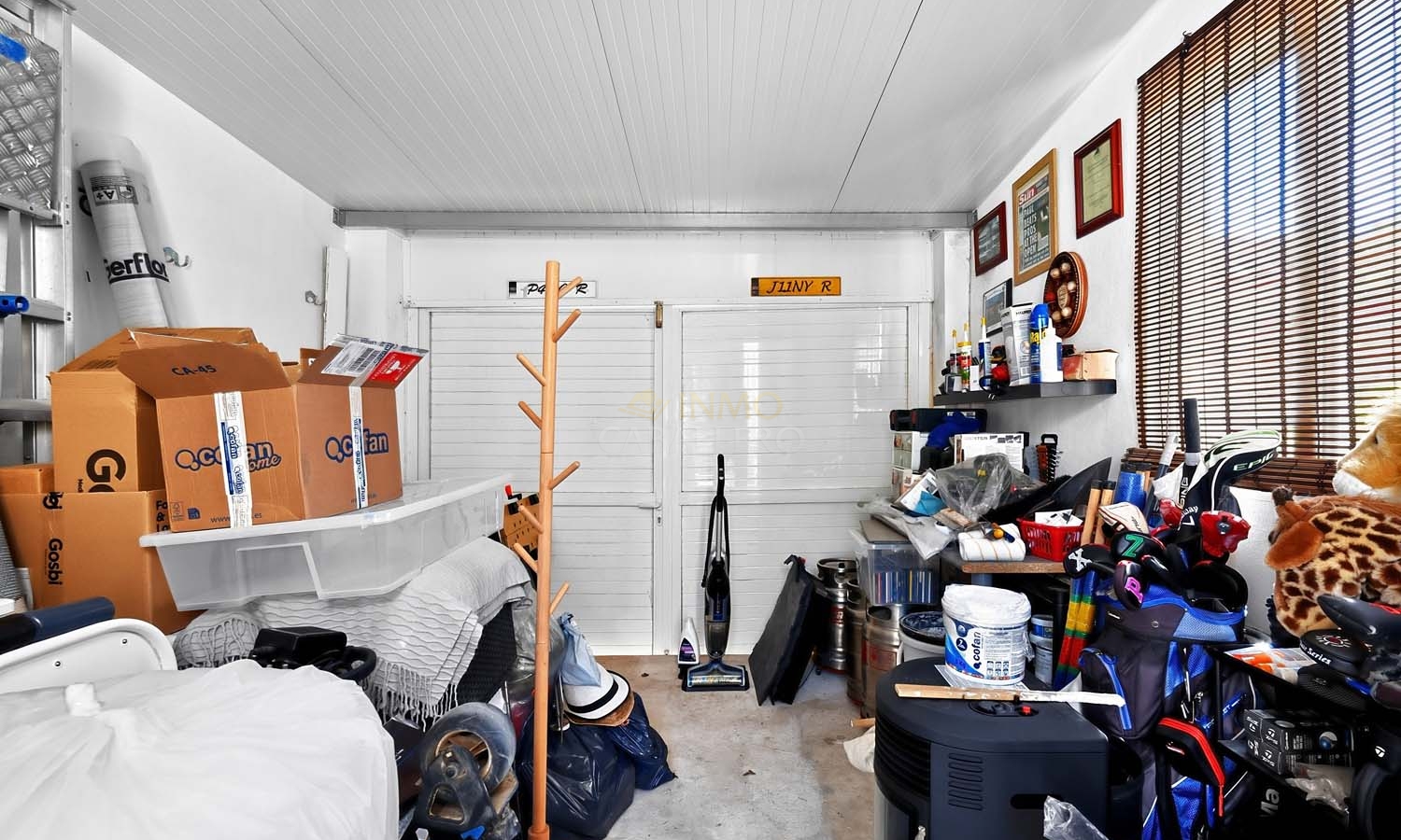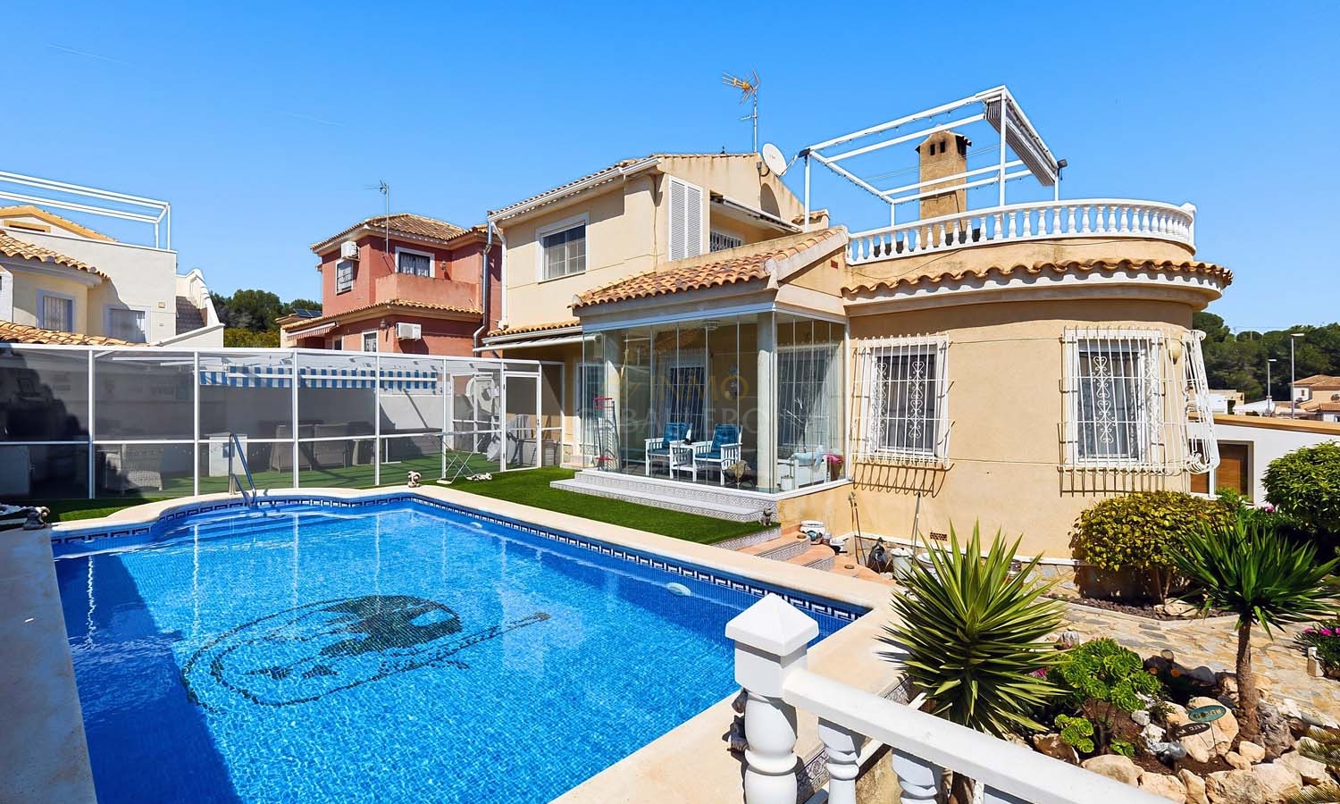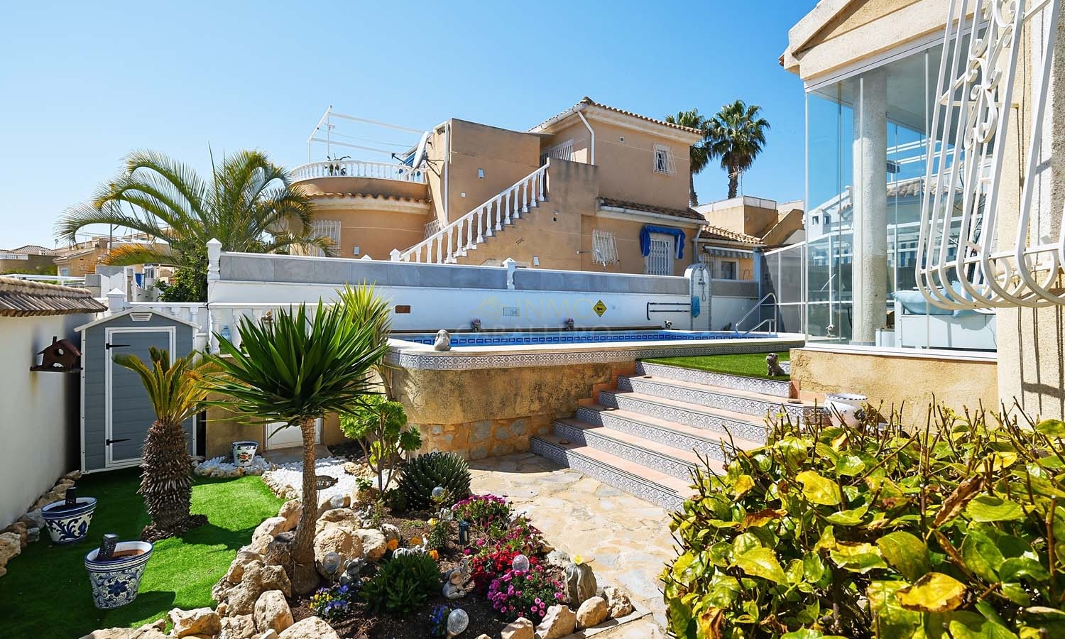 La villa se encuentra en una bonita parcela bien cuidada, con abundante vegetación. Dispone de una gran piscina con amplio espacio para tomar el sol. También cuenta con una fantástica cocina exterior con bar, barbacoa de obra y zona de estar, protegida con mosquiteras, perfecta para recibir invitados y disfrutar de las cálidas noches. La villa también incluye un amplio cobertizo en la parte delantera de la parcela y un trastero más pequeño bajo la escalera.