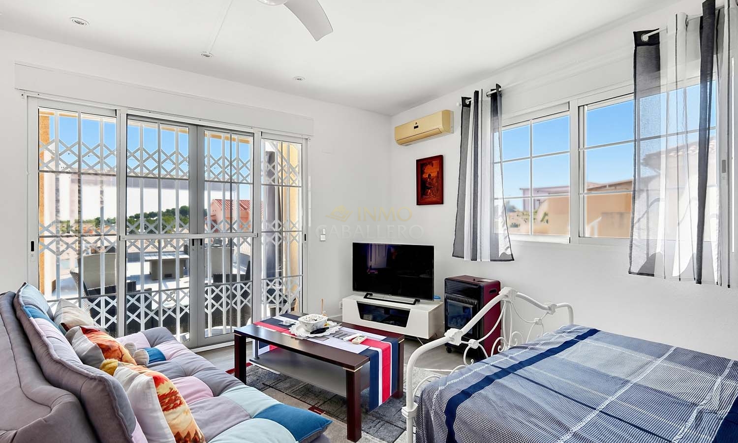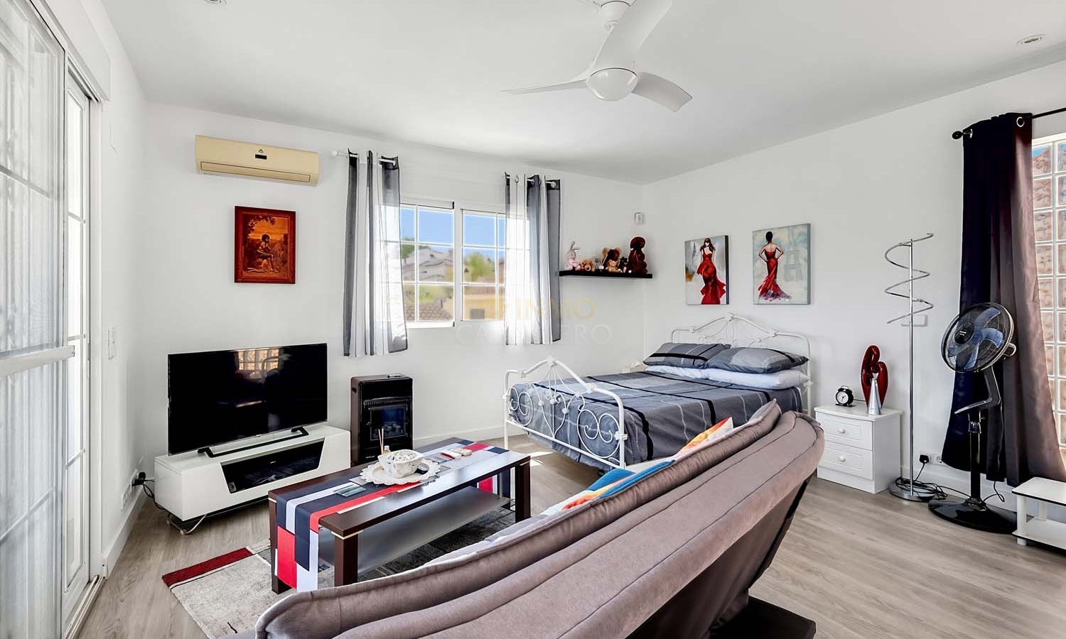 Una escalera exterior conduce a la planta superior, donde se ubica un apartamento independiente para invitados, que consta de un amplio dormitorio con zona de estar, cocina americana y baño. Desde allí se accede a una gran terraza privada con preciosas vistas a los naranjos y al mar.