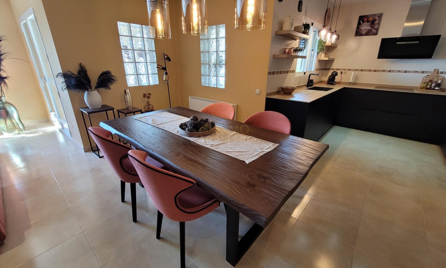 En la planta baja, un vestíbulo da paso a un espacioso y luminoso salón-comedor con una cocina americana totalmente equipada. Una chimenea con estufa de pellets completa este acogedor espacio. Un gran ventanal ofrece acceso a una agradable terraza acristalada con vistas a la piscina.